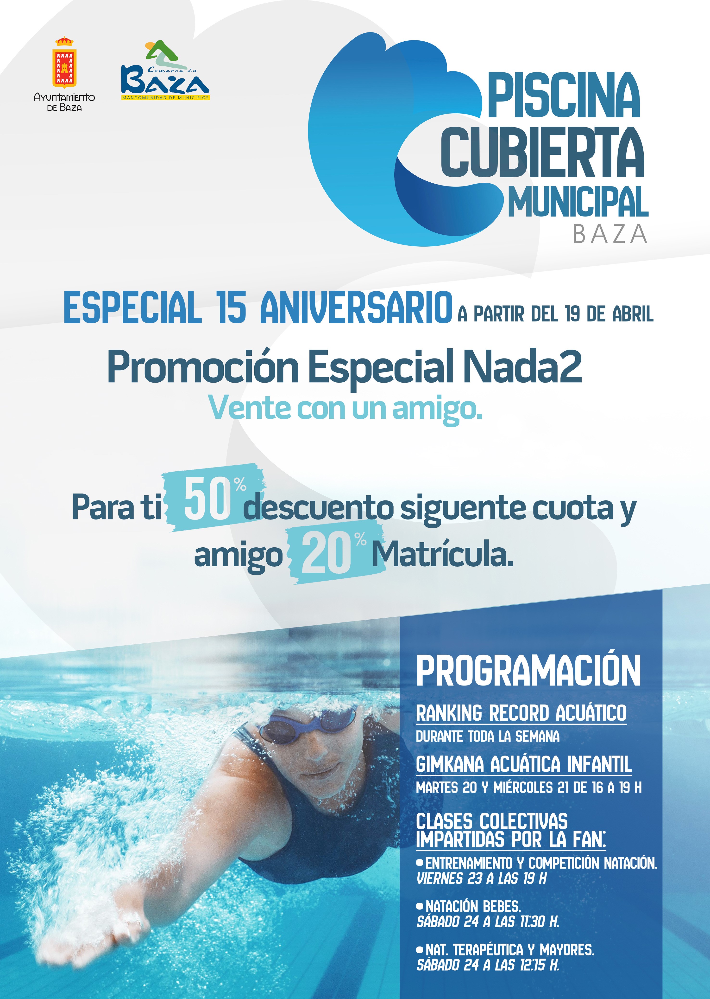El Ayuntamiento conmemora el 15 aniversario de la apertura de la piscina municipal cubierta con promociones especiales y actividades adaptadas a la situación actual. Con motivo del 15 aniversario de la apertura de la piscina municipal cubierta, el Ayuntamiento de Baza ha diseñado una semana de actividades adaptada a la situación actual de pandemia, además de promociones que estarán vigentes hasta final de año.