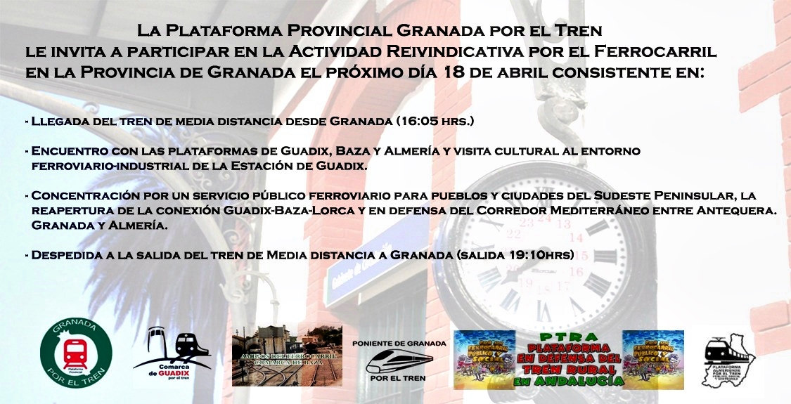 Granada por el Tren, Guadix por el Tren y Amigos del Ferrocarril Comarca de Baza han organizado para este domingo 18 de abril el evento, que también cuenta con la participación de la Plataforma Tren Rural en Andalucía, Poniente de Granada por el Tren y la Plataforma Almeriense por el Ferrocarril. Tras un breve recorrido por la historia ferroviaria de estos territorios, se realizarán las siguientes demandas al Gobierno:
