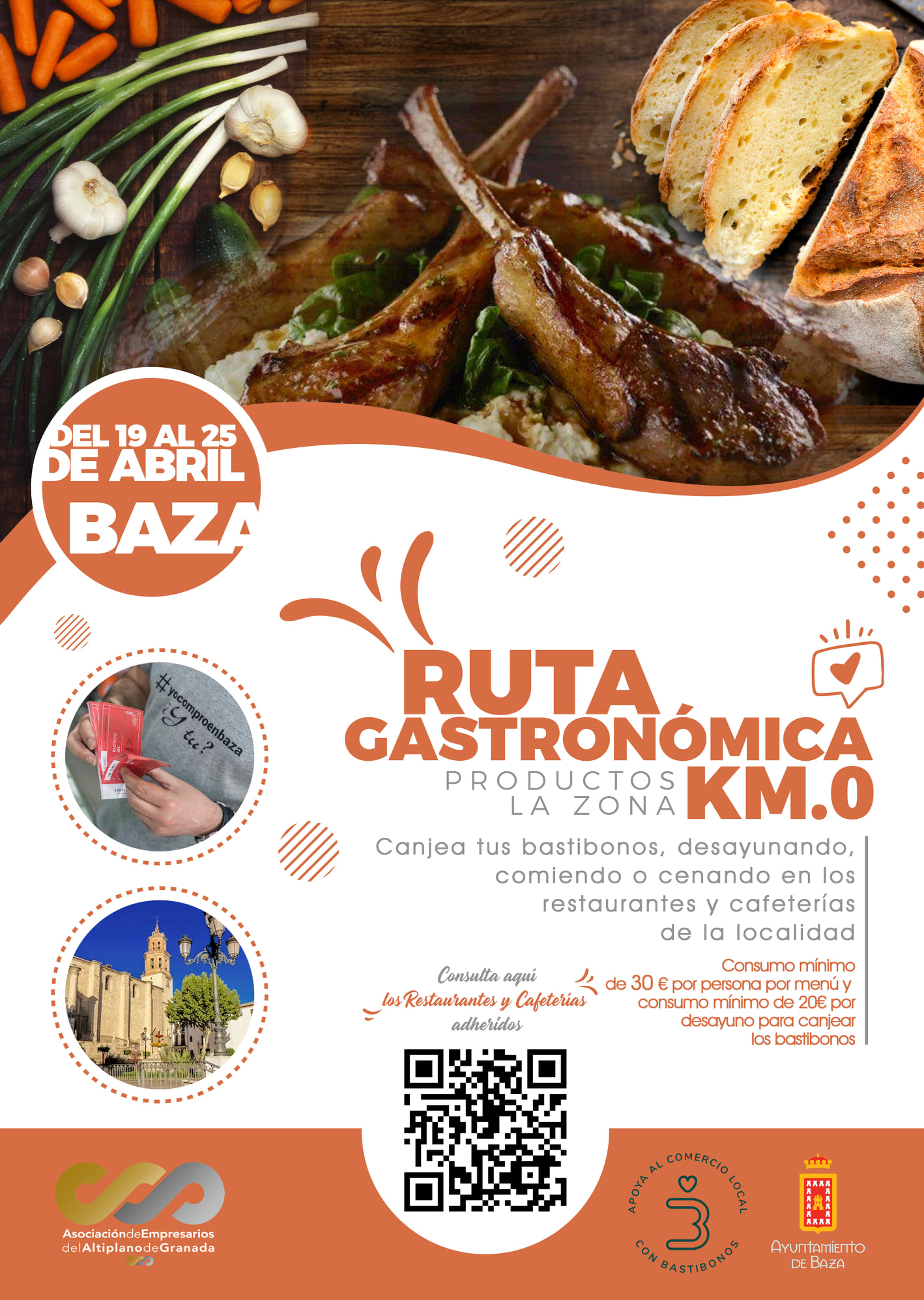 El Ayuntamiento de Baza muestra su apoyo al sector hostelero en la ‘Ruta Gastronómica km 0’. El Ayuntamiento de Baza colabora estrechamente en las jornadas gastronómicas que llevan por nombre ‘Ruta Gastronómica km 0’ que la Asociación de Empresarios del Altiplano Granadino ha organizado en el municipio. Dichas jornadas se celebrarán del 19 al 25 de abril con unos menús o desayunos que se podrán pagar con BastiBonos.