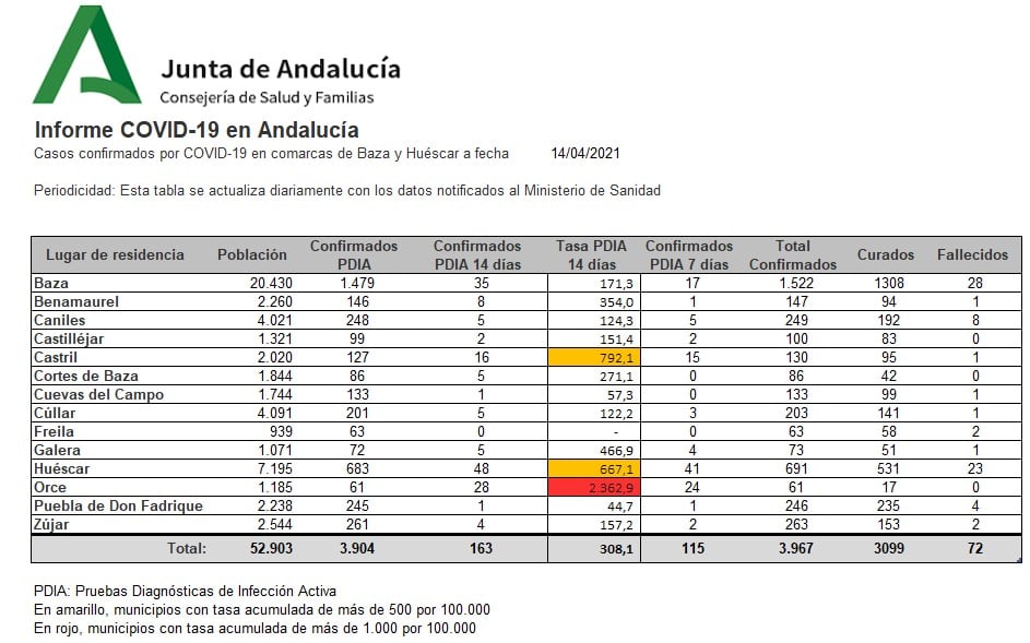 En cuanto al estado de las tasas de incidencia en las comarcas de Baza y Huéscar, después de que la Junta de Andalucía no informara de la situación del martes 13, el estado de los datos más significativos es el que sigue a continuación, en una tabla que puede ser ampliada al clicar sobre ella: