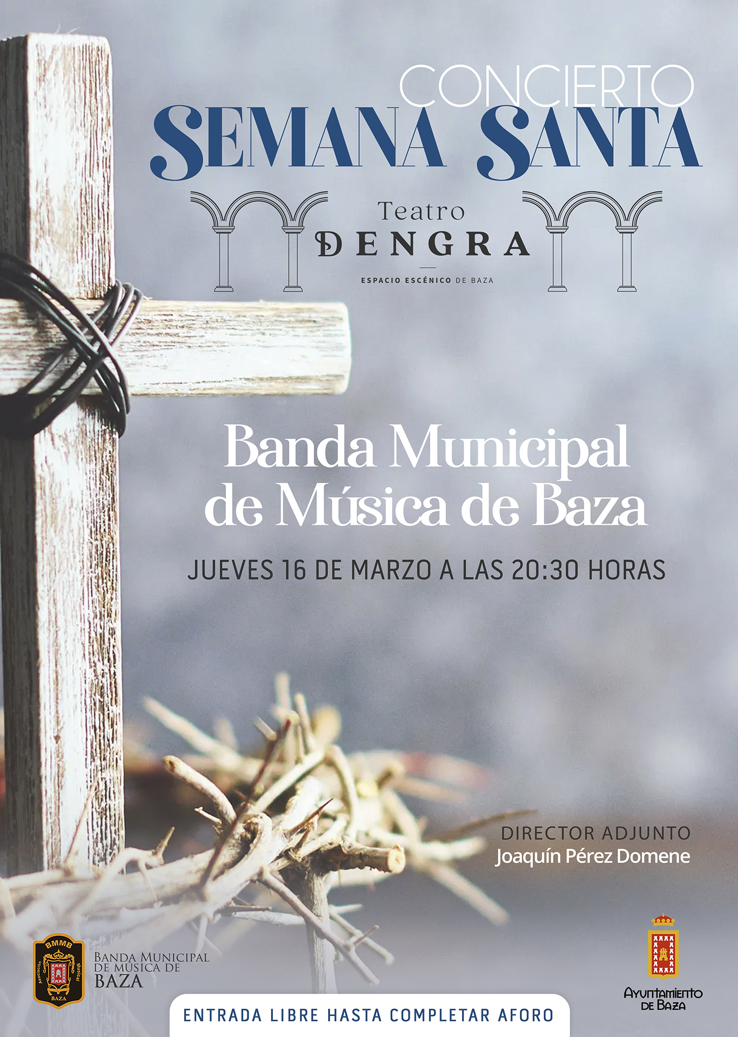 A las 20,30 horas de hoy jueves llega el Concierto de Semana Santa de la Asociación Banda Municipal de Música de Baza, en el Teatro Dengra. La música cofrade alcanza en estos días la máxima atención y son numerosos los conciertos y actuaciones que se están realizando en numerosos lugares en torno a la Música de Semana Santa, a lo que no se queda ajena la Asociación de la Banda Municipal de Música bastetana.