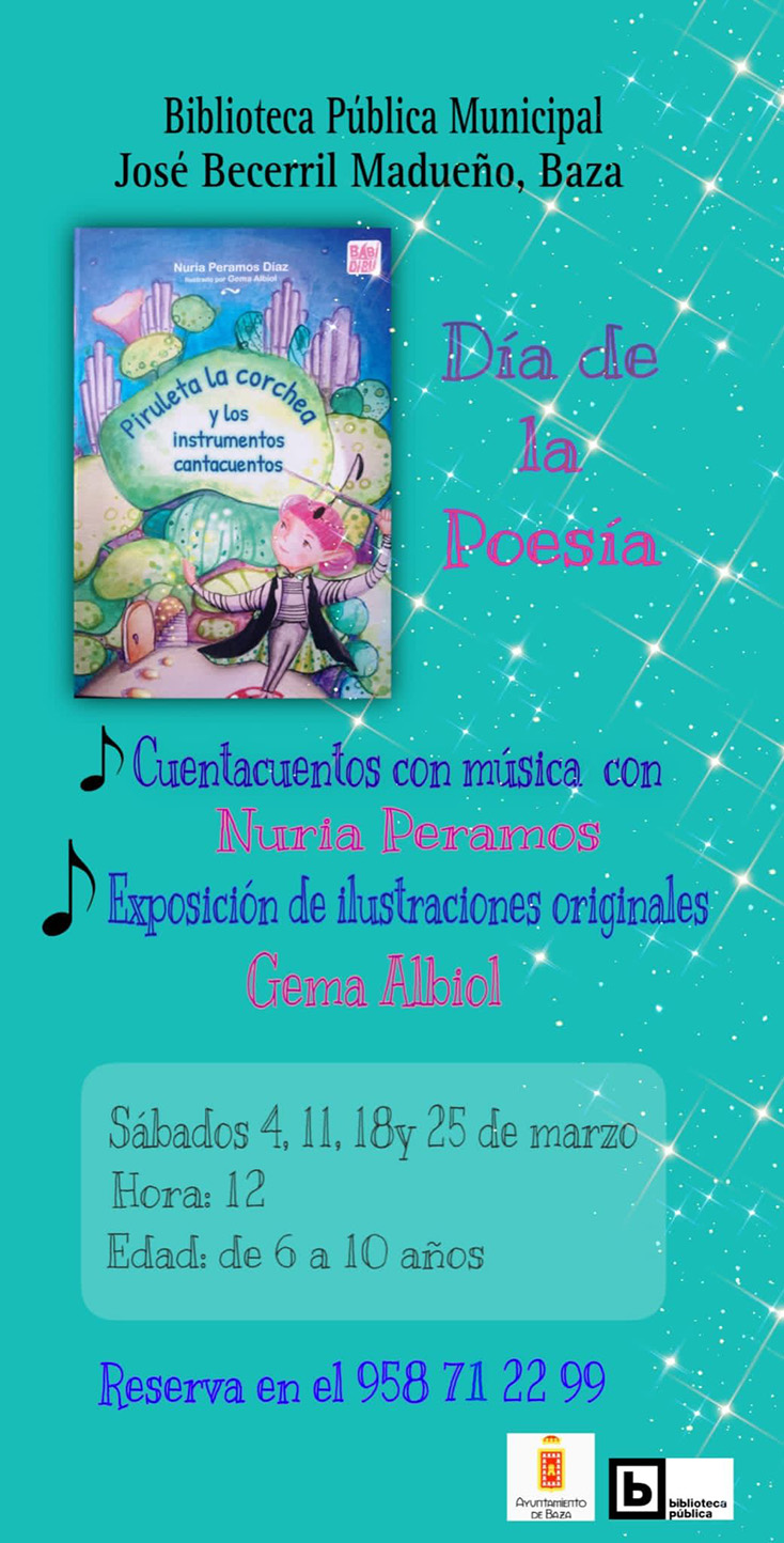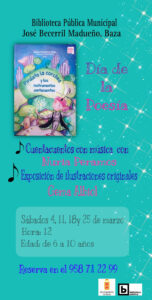 Por un lado, mañana viernes 17 de marzo, a las seis de la tarde, llegará el acostumbrado cuentacuentos de cada viernes y, por otra, el sábado 18 de marzo, a las 12 del mediodía, será el turno de una, nueva sesión del Cuentacuentos especial de este mes de marzo, organizado con motivo del Día de la Poesía, con música en directo y la participación de la autora.