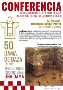 El catedrático de arqueología Juan Blánquez analiza el descubrimiento de la Dama de Baza en una conferencia este viernes a las 20h en el Salón Ideal. El Ayuntamiento de Baza continúa inmerso en la celebración del 50 Aniversario del Descubrimiento de la Dama de Baza, un evento que ofrece actividades a lo largo de todo un año (desde julio de 2021 hasta julio de 2022) con el doble objetivo de hacernos visibles en el mundo a través de la divulgación del patrimonio arqueológico íbero de Baza y, al mismo tiempo, de impulsar un mejor conocimiento de la figura de la Dama de Baza. A eso contribuirá sin duda la conferencia “El descubrimiento de la Dama de Baza. Mucho más que un hallazgo escultórico” que impartirá Juan Blánquez, catedrático de arqueología en la Universidad Autónoma de Madrid. La cita es este viernes 17 de septiembre a las 20h en el Salón Ideal, Auditorio Enrique Pareja, con entrada libre hasta completar el aforo. El Ayuntamiento tiene previsto además grabar el evento para su posterior reemisión a través de las redes municipales.