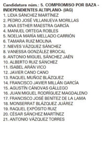 Candidatura de Compromiso por Baza en las últimas elecciones municipales. (Clicar encima para ampliar) - Creemos que las negociaciones con el Partido Popular deben regirse por criterios programáticos, exigiendo la asunción del equipo de gobierno de propuestas de nuestro programa como la ampliación de las plantillas de policía local y bomberos, la creación de un plan de rehabilitación de viviendas del centro histórico destinadas a vivienda pública, la implantación de viviendas tuteladas para mayores y personas con necesidades especiales o la creación de un vivero de empresas. Son estos proyectos los que harán que mejore la ciudad de Baza, y no lo que se está poniendo encima de la mesa por nuestra portavoz.