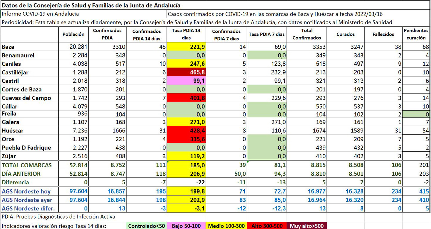 A nivel de municipios, destacar que la localidad de Freila no solo tiene sus dos tasas de incidencia a cero, sino que tampoco tiene ya ningún afectado pendiente de curación, mientras que Cortes de Baza se unía ayer a los municipios que tienen las dos tasas a cero y Orce ponía a cero su tasa de incidencia a 7 días. También mejoraba Galera, al pasar del nivel “alto” al “medio”, mientras que Castril daba un paso atrás pasando del nivel “Controlado” al “Bajo”.
