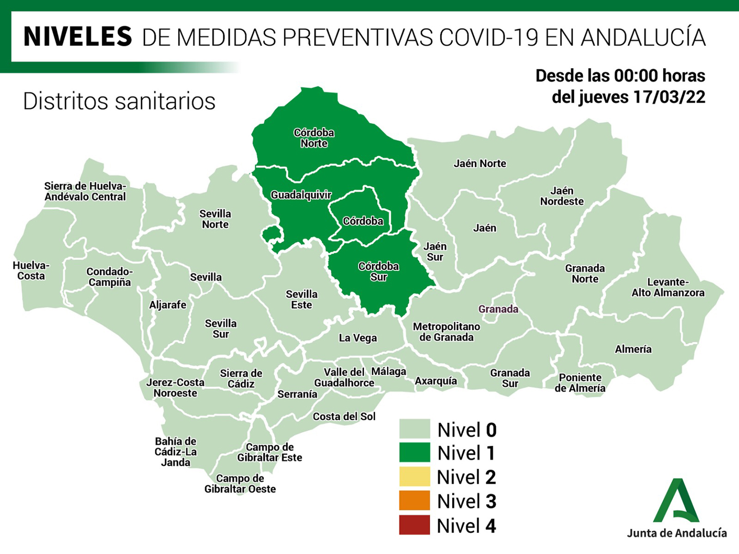 En lo que se refiere a la provincia de Granada, todas las áreas y distritos sanitarios fueron incluidos en el nivel de alerta cero, al igual que el resto de las provincias, con la excepción de los cuatro distritos cordobeses, que estarán en el nivel 1, al igual que el municipio sevillano de Peñaflor, por pertenecer al Distrito Guadalquivir de Córdoba.