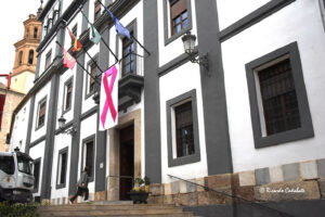 Un gran lazo rosa en el balcón del Ayuntamiento recuerda el Dia Mundial del Cáncer de Mama
