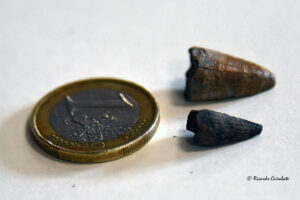 Dientes de cocodrilo hallados en el yacimiento Baza-1: el más grande en 2023 y el más pequeño en 2024