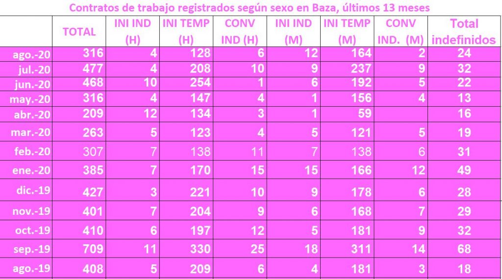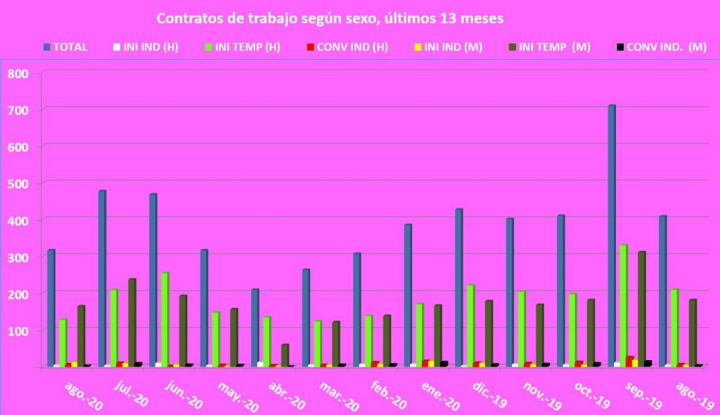 Sí que disminuyó en agosto la cifra de contratos suscritos, pasando de 477 a 316, ofreciendo una situación de notable disminución, algo que tampoco desentona en las cifras que se están produciendo este año, a pesar de lo que se han sumado otras 24 contrataciones indefinidas a favor de 10 hombres y 14 mujeres.