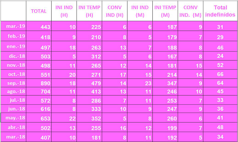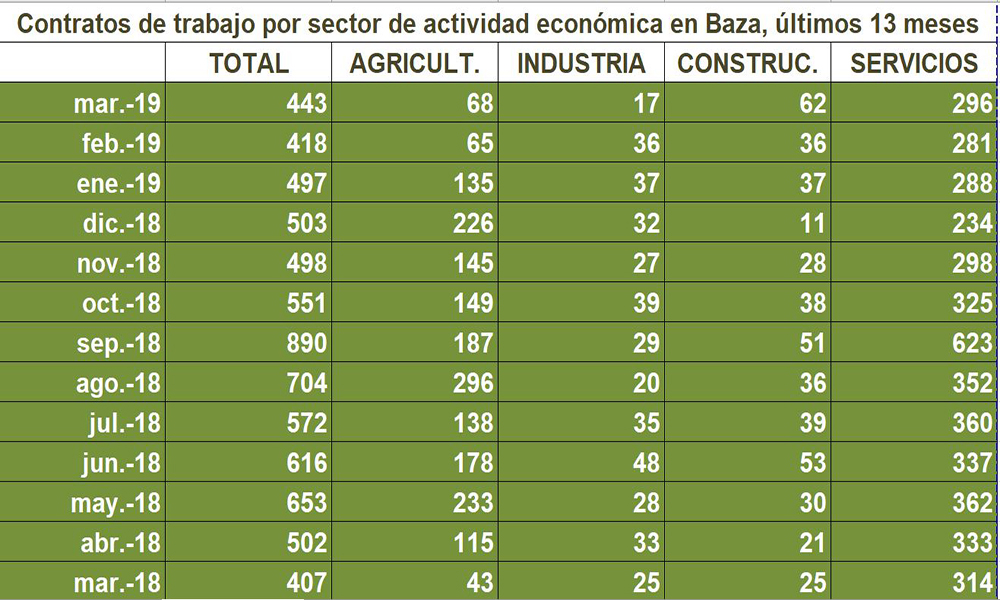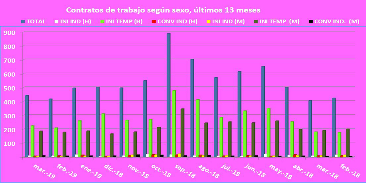 En cuanto al número de contratos, se han firmado 443 de los que 16 se han iniciado con la condición de indefinidos y otros 15 más se han convertido a dicha modalidad lo que dentro de la precariedad general es siempre algo a destacar. Notable ha sido también el aumento habido en las contrataciones del sector de la construcción que se ha ido a casi el doble del mes anterior, lo contrario que en el caso de la industria, donde las contrataciones han sido la mitad que un mes antes.