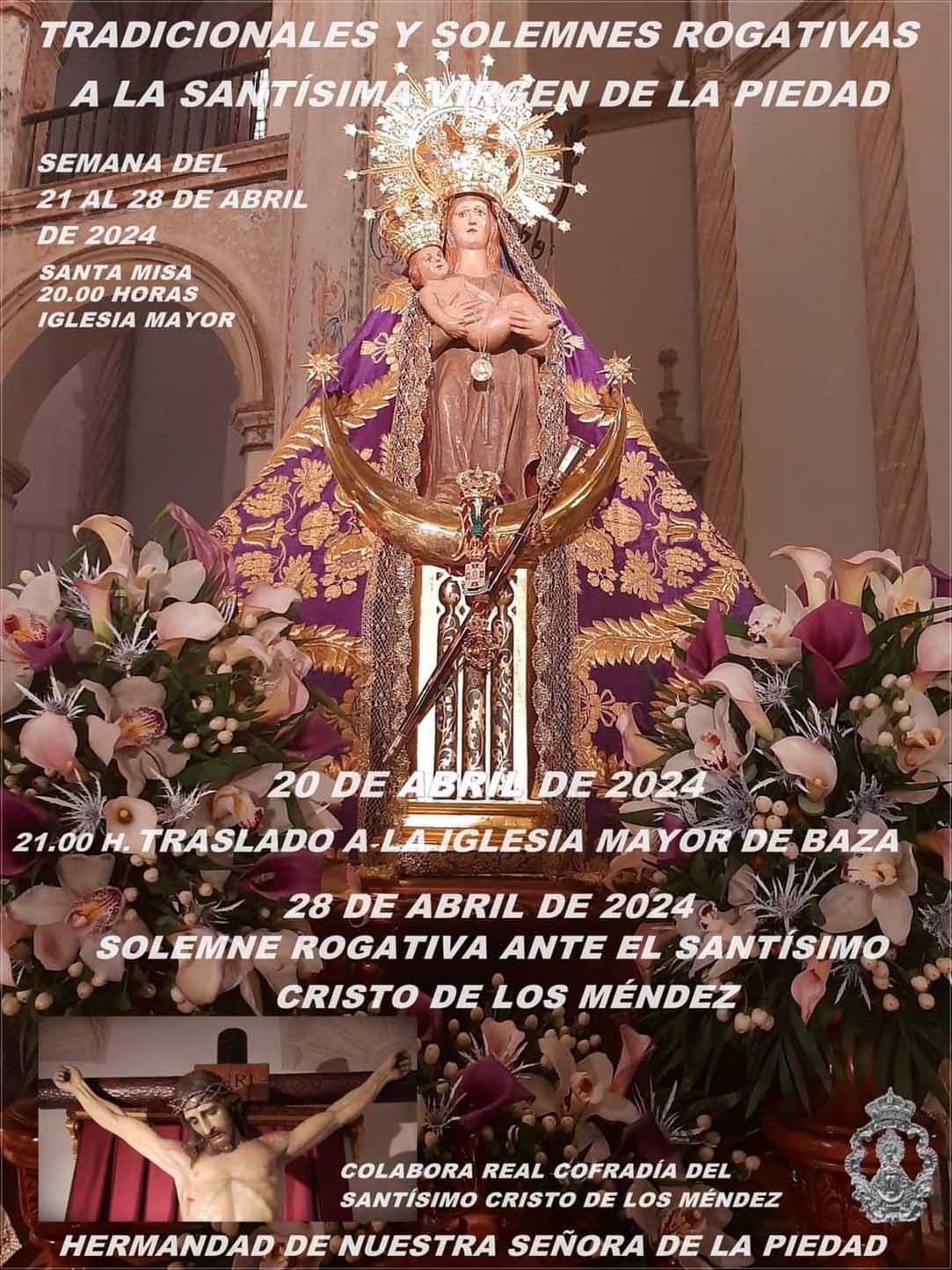 El próximo sábado se inician las *Tradicionales Rogativas a la Santísima Virgen de la Piedad, con su traslado a la Iglesia Mayor, tras los cultos en la Iglesia de la Merced. El ritual de las Rogativas ya fue descrito por el P. Mercedario fray Juan Barroso (1744), quien dejó escritos los detalles de una tradición por la que, “el viernes penúltimo de abril, en que comienzan las fiestas de los labradores, a la hora de costumbre se bajará la imagen de Ntra. Sra. de su camarín, para ponerla en andas, dándose entre tanto los repliques acostumbrados (los que se darán siempre que se suba o baje al camarín). Al día siguiente por la tarde al terminar el coro de la Colegiata subirá el Clero de la misma con Cruz alzada y ornamentos morados para bajarla procesionalmente al dicho templo, donde permanecerá hasta el domingo último de dicho mes, haciéndole en esos días rogativas por la mañana después de la misa conventual, y Salve y Letanía por la tarde después de Coro, y demás cultos que de tiempo inmemorial se le dedican.