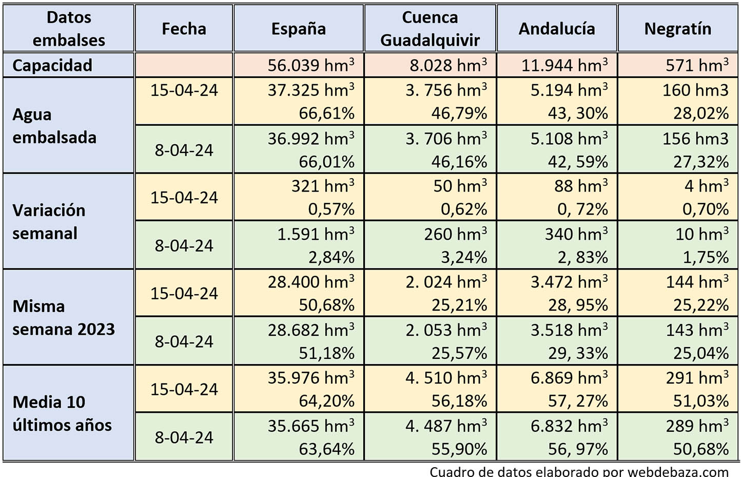 De todo ello y de otros datos más, ofrecemos, en el siguiente cuadro, las cifras comparativas de la evolución del agua almacenada esta última semana en los diferentes ámbitos, en la que se puede comparar con la evolución habida en la anterior semana: