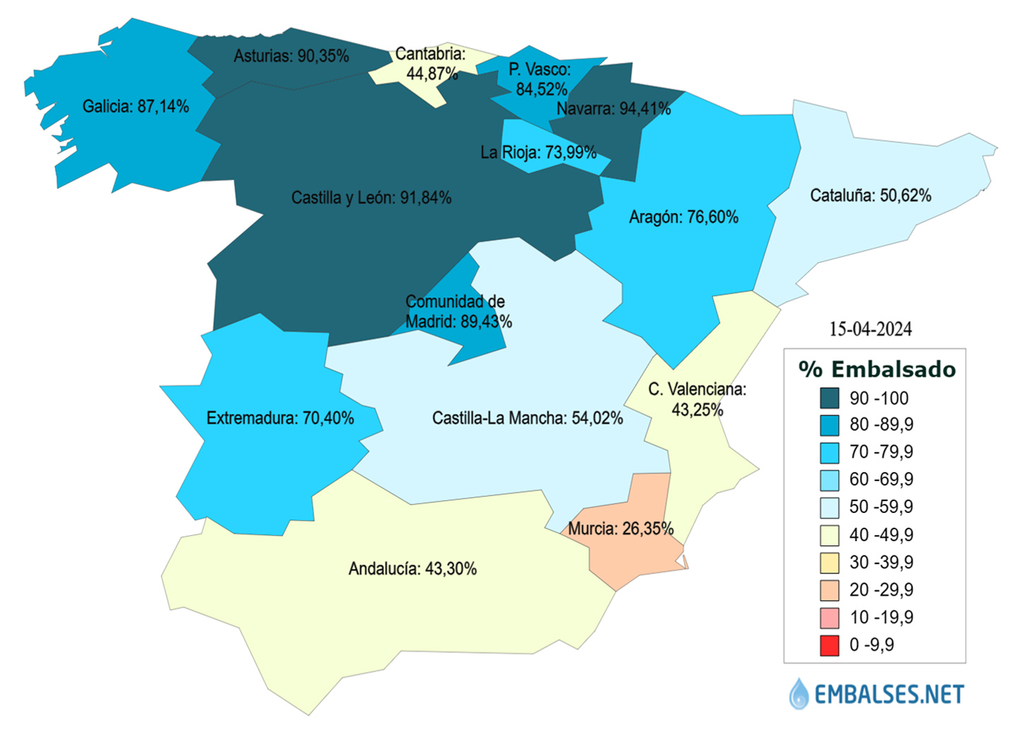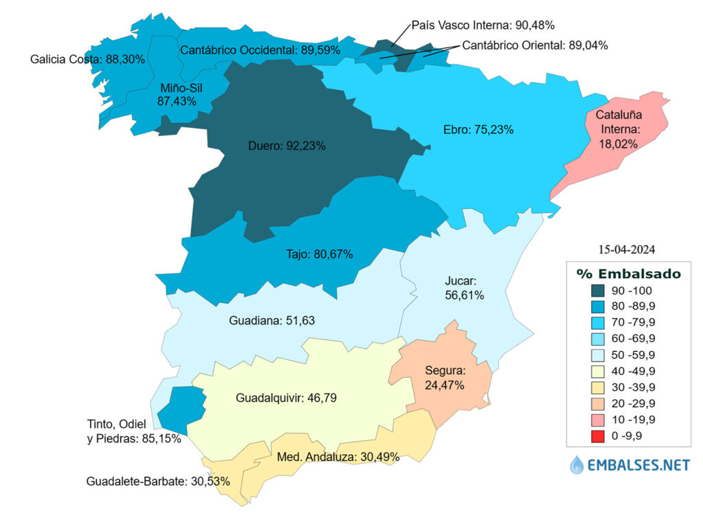 Las cuencas que se encuentran con un almacenamiento superior al 60% son: la del Duero al 92,2%, Cuencas internas del País Vasco al 90,5%, Cantábrico Occidental al 89,6%, Cantábrico Oriental se encuentra al 89%, Galicia Costa al 88,3%, Miño-Sil al 87,4%, Tinto, Odiel y Piedras al 85,2%, Tajo al 80,7% y Ebro al 75,2%.