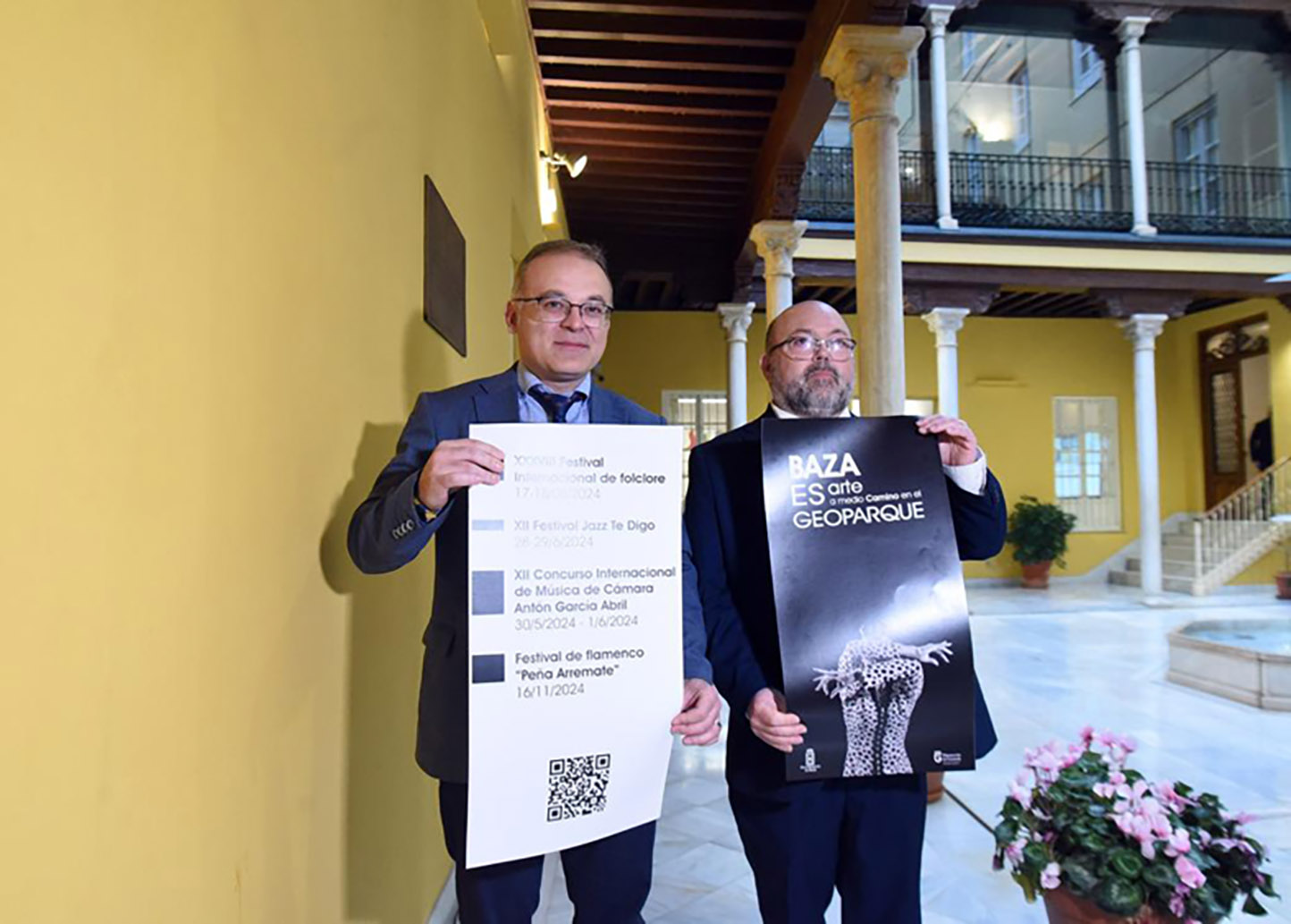 A todo ello, quiso añadir un nuevo privilegio, cual fue el de saber conjugar la buena música con la danza y el folclore, lo que permite a Baza acoger numerosos eventos musicales, con los que se ha conformado el proyecto turístico que presentarán en FITUR, entre los que se incluyen el Festival Internacional de Folklore, que celebrará el 17 y 18 de agosto su 38ª edición, organizado por el Grupo Municipal de Coros y Danzas y “magnífica excusa” para pasar dos días en Baza y disfrutar de sus alojamientos cueva, de sus restaurantes y gastronomía. Citó a continuación al festival de Flamenco de la Peña Arremate en el que cada año participan grandes figuras del flamenco, en otoño y en el Teatro Dengra, en una jornada que puede ser un primer contacto con Baza. Después, habló del Jazz Te Digo Festival en el escenario único de la Plaza Mayor, el último fin de semana de junio, con un ambiente especial y una oportunidad de vivir Baza con los amigos. No olvidó el Concurso Internacional de Música de Cámara “Antón García Abril”, que llega a su 12ª edición y es el único en España dedicado a este tipo de música, a finales de mayo y principios de junio; todo lo cual se suma a los conciertos de la Banda Municipal de Música o de los coros polifónicos “Alcazaba” y “Juan Hernández”, las actuaciones de la OLE Velasco Villegas, los conciertos de los coros rocieros y la extensa programación musical de Feria.