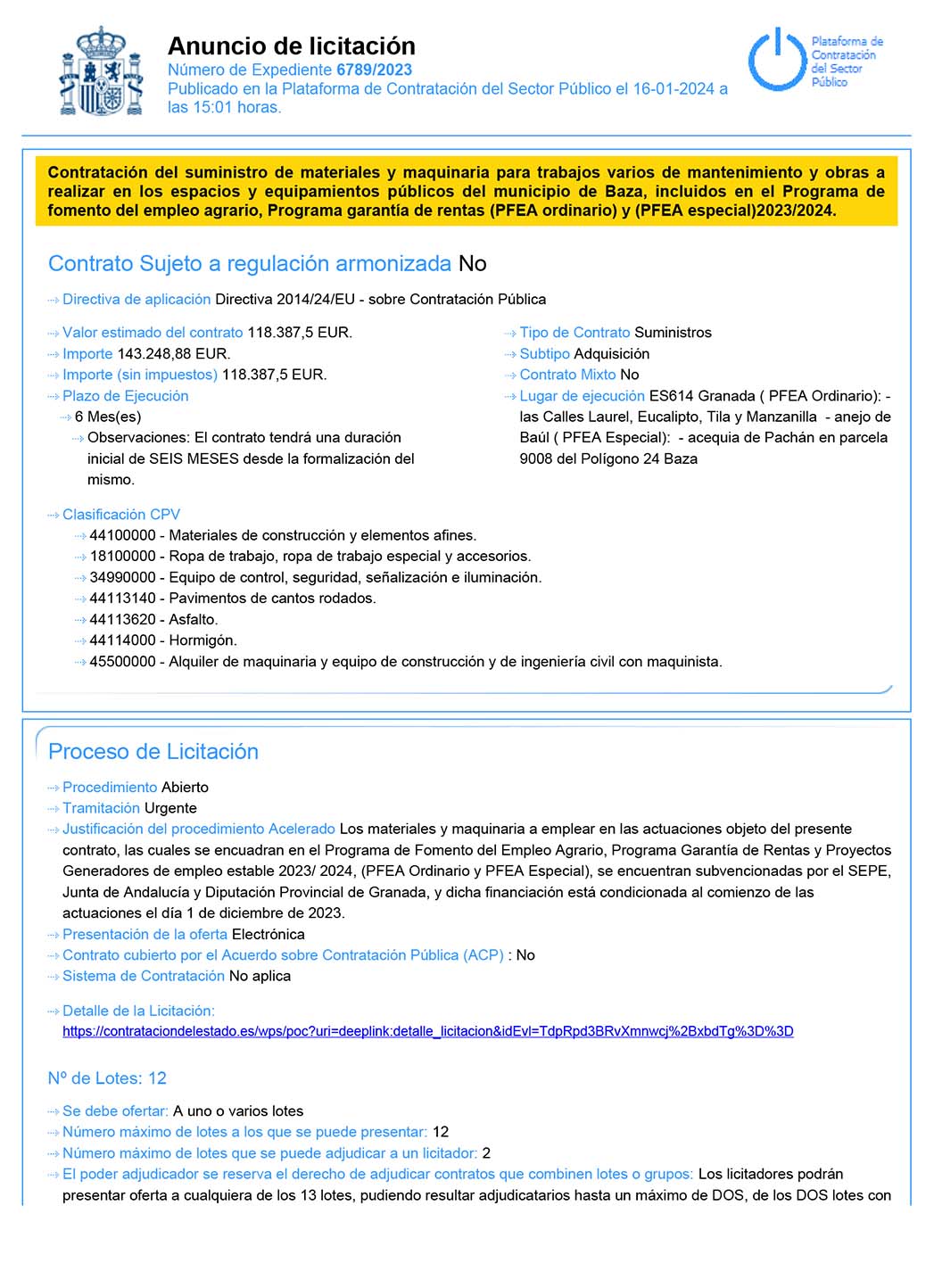 Sale a licitación el contrato de suministro de materiales y maquinaria para trabajos varios de mantenimiento a cargo del Ayuntamiento de Baza. Ya está publicado en la Plataforma de Contratación del Sector Público el anuncio de licitación que rige la contratación del suministro de materiales y maquinaria para trabajo varios de mantenimiento y obras a realizar en distintos espacios y equipamientos públicos del municipio de Baza, incluidos todos en el Programa de Fomento del Empleo Agrario y Programa de Garantía de Rentas (PFEA ordinario) y (PFEA especial) 2023/2024.