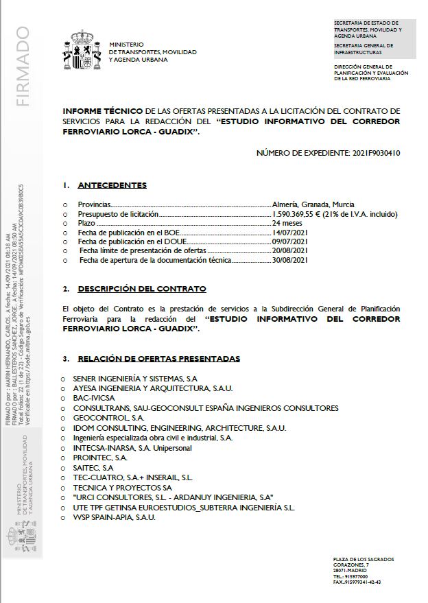 Publicamos el Informe Técnico de las ofertas presentadas a la licitación del contrato para el estudio informativo del corredor ferroviario entre Lorca y Guadix. Se trata del documento del Ministerio de Transportes Movilidad y Agenda Urbana firmado a tal fin, cuyo objeto es la prestación de servicios a la Subdirección General de Planificación Ferroviaria para la redacción del “Estudio Informativo del Corredor Ferroviario Lorca – Guadix”, documento al que se accede en este enlace.