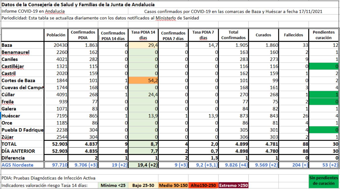 En los últimos datos ofrecidos ayer por la Consejería de Salud y Familias de la Junta de Andalucía, se añadían un positivo más en Baza y otro en Huéscar, lo que modifica el número de contagios y la tasa a 7 y 14 días en ambas localidades. La ciudad bastetana está ya con 6 casos activos a 14 días y una tasa de incidencia de 29,4, mientras que Huéscar tiene un único caso y una tasa de 13,9 por 100.000 habitantes.