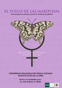 Como decimos, será una conferencia dialogada a cargo de Úrsula Tutosaus, bajo el título de “El vuelo de las mariposas”. Una perspectiva artística contra la violencia de género para el que la entrada será libre, hasta cubrir aforo, invitándose especialmente a las personas interesadas en una temática que concita tanto interés.