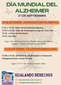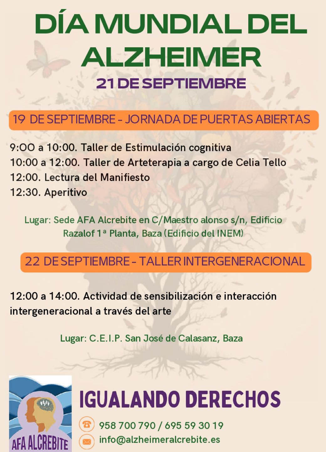 El propio 21 de septiembre, Día Mundial del Alzheimer, se desarrollará una jornada de actividades en la sede de Alcrebite. La agenda comenzará a las 9:00 horas con un taller de estimulación cognitiva, continuará de 10:00 a 12:00 con un taller de arteterapia dirigido por Celia Tello y, a las 12:00, se procederá a la lectura del manifiesto. La mañana concluirá con un aperitivo a las 12:30 horas.