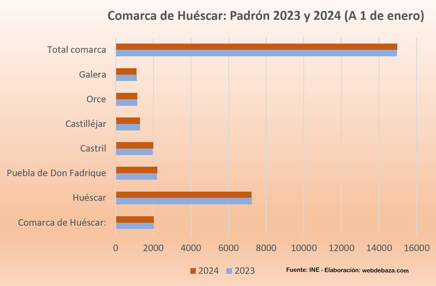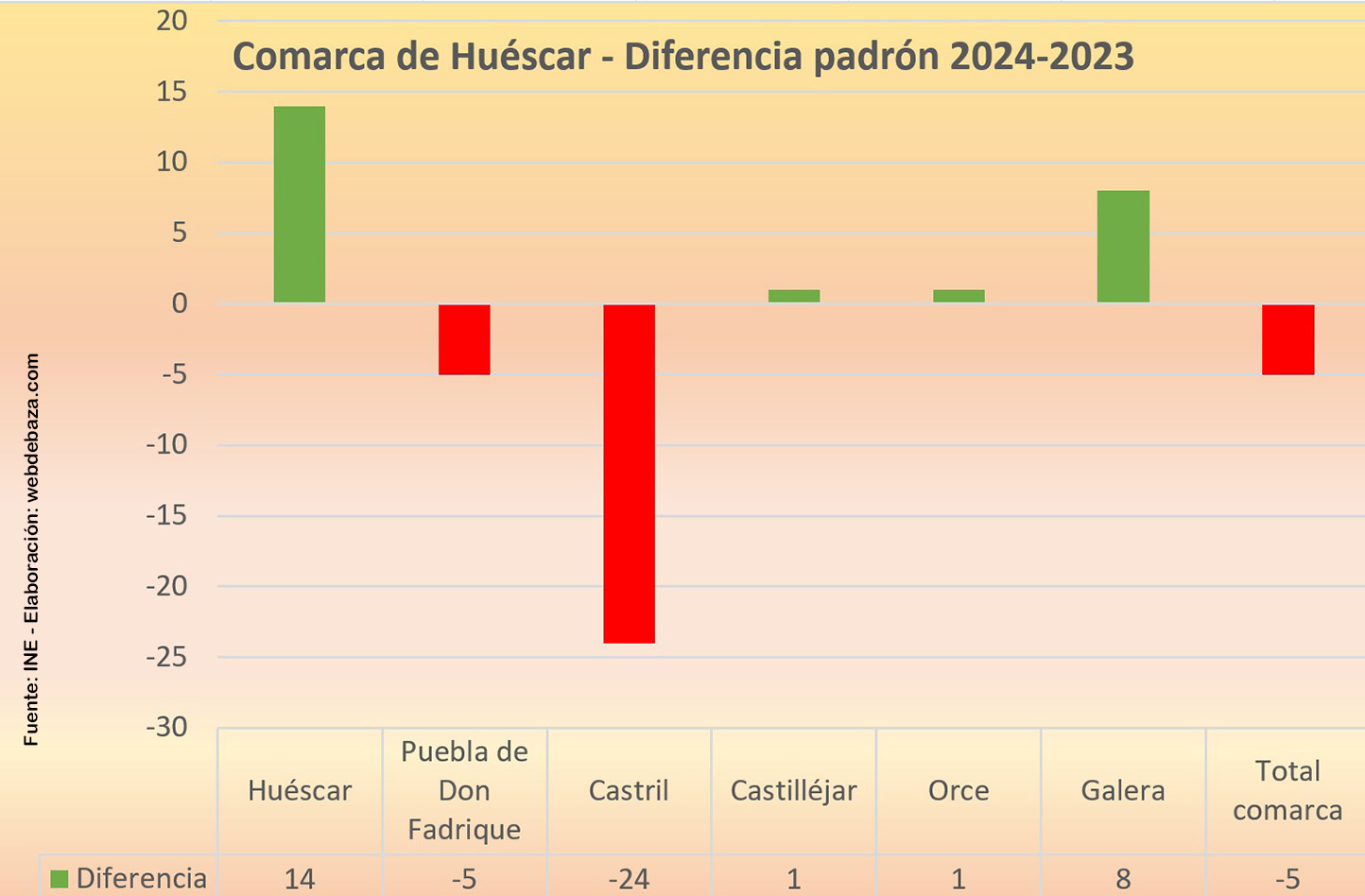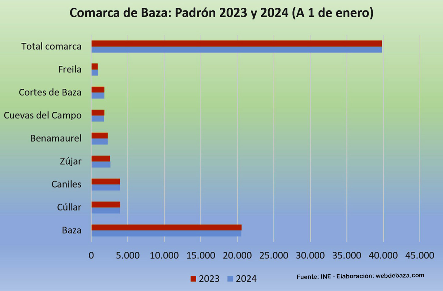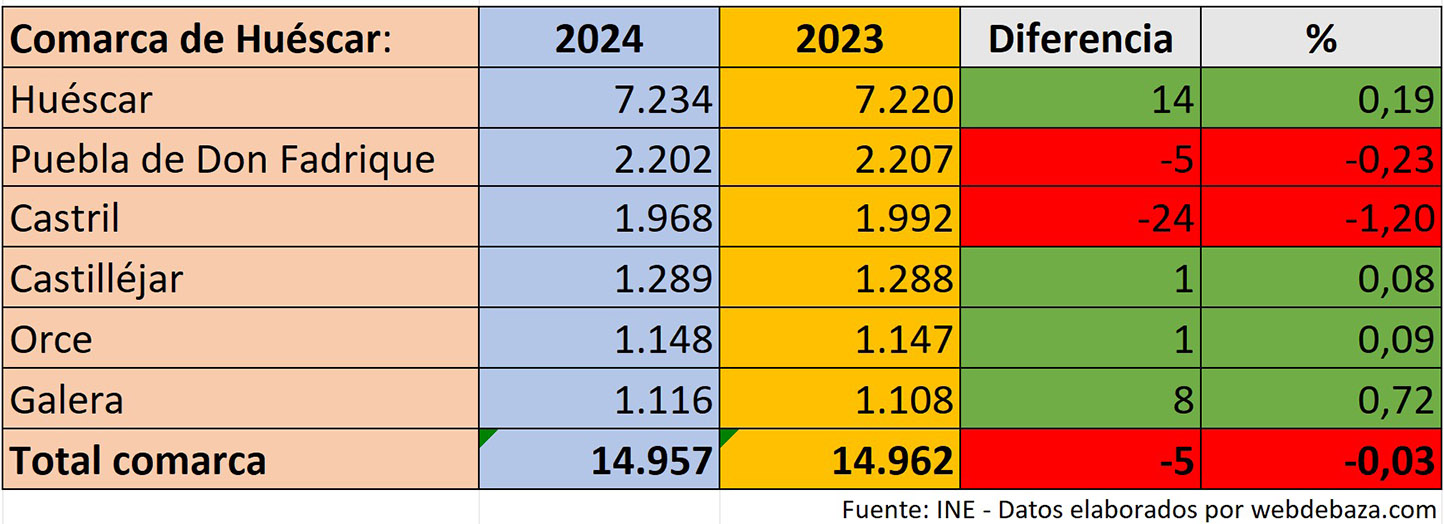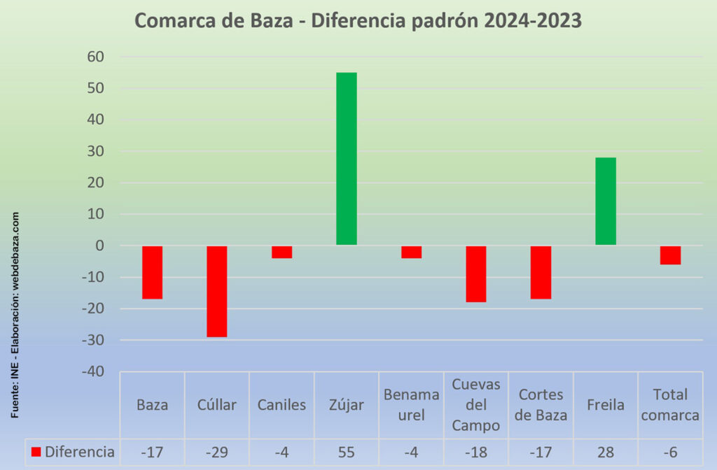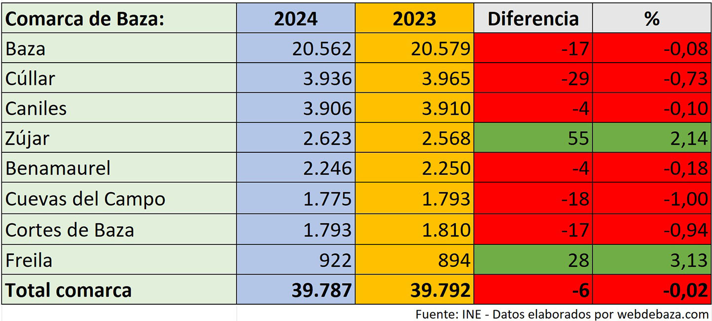 La notable mejora de población empadronada en Zújar y Freila no impide un balance negativo del padrón de 2024 en la comarca de Baza, ni mejoran tampoco el de la comarca de Huéscar. Cifras facilitadas por el Instituto Nacional de Estadística y que reflejan que solo dos municipios de la comarca bastetana han mejorado sus cifras poblacionales y, además, de forma destacada: Zújar con 55 y Freila con 28 han marcado la pauta de un ascenso que no se ha consolidado a nivel comarcal.