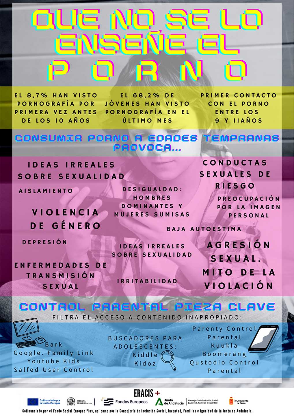 El control parental en redes sociales es clave para proteger a los menores del acceso a contenidos pornográficos. La Red Local de Acción en Salud (RELAS), enmarcada en la Estrategia de Promoción de una Vida Saludable en Andalucía (EPVSA), junto con la ERACIS+ desde el Plan Local de Intervención en Zonas Desfavorecidas Cuevas de Baza cofinanciado por el Fondo Social Europeo +  así como por la Consejería de Inclusión Social, Juventud, Familias e Igualdad de la Junta de Andalucía, tiene como objetivo ayudar a localizar la salud en el municipio de Baza realizando infografías preventivas de temas relevantes, en este caso el acceso de menores a  pornografía y sus consecuencias.