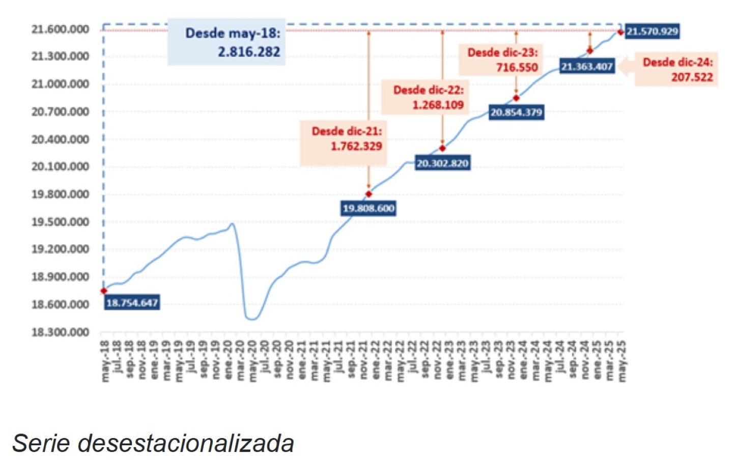 Además, en el acumulado anual desde enero de 2025, el sistema ha sumado 229.165 afiliados más, consolidando una tendencia ascendente que se mantiene estable desde los años posteriores a la pandemia. En comparación con junio de 2024, la afiliación ha aumentado en 457.216 personas, lo que demuestra una evolución sostenida y sólida del empleo.