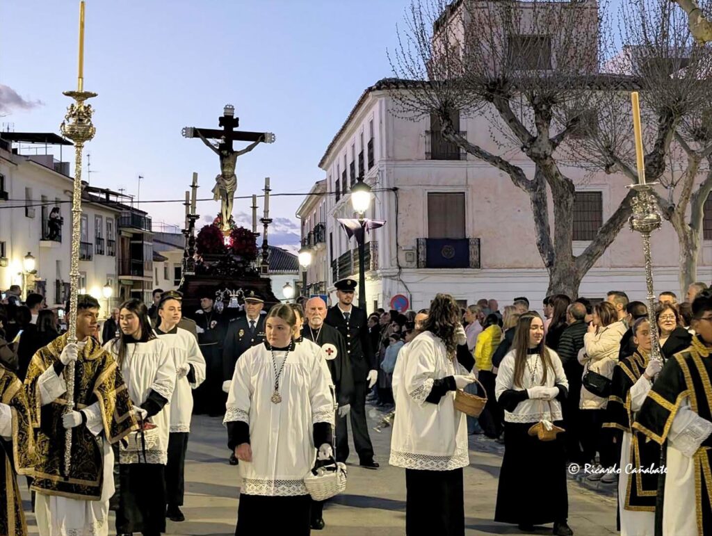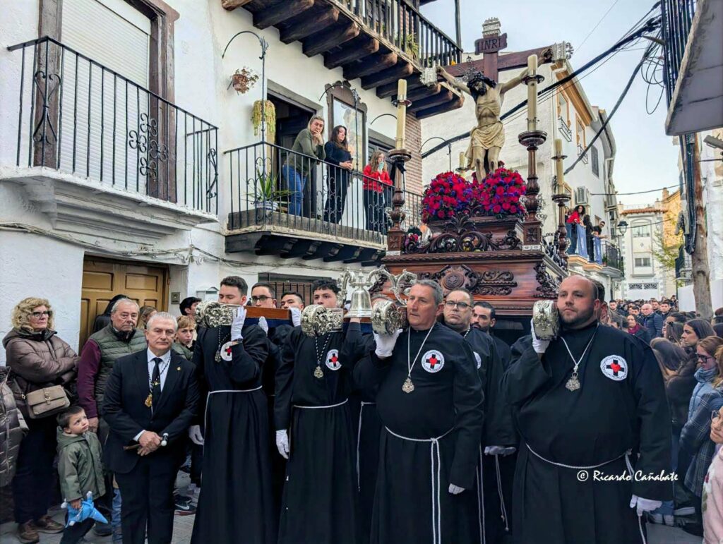 Como es tradición, abría el cortejo el paso del Cristo de la Misericordia, cuya imagen, recientemente restaurada, lució con especial solemnidad en la tarde-noche bastetana. Fue portado a hombros por su cuadrilla de horquilleros, que completó el recorrido sin relevos, en un esfuerzo destacado que no pasó desapercibido. Los acompañaban los sones de la Banda de Tambores y Cornetas Expiración, de la vecina localidad de Huéscar, que volvió a dejar patente su calidad y experiencia. Precedían el conjunto la Cruz de Guía y los penitentes más jóvenes, seguidos por los distintos tramos que acompañaban tanto al Cristo como a la Virgen.