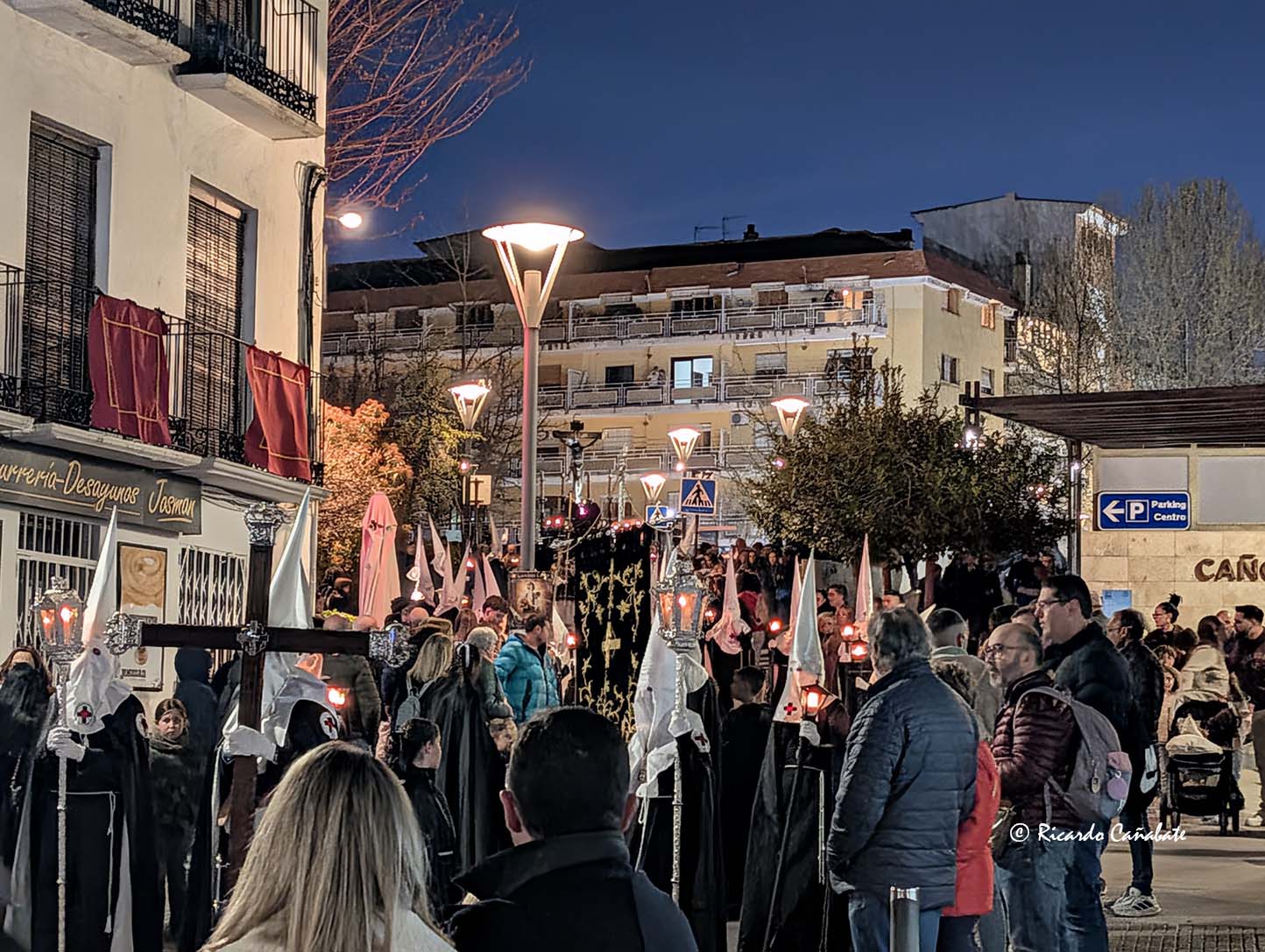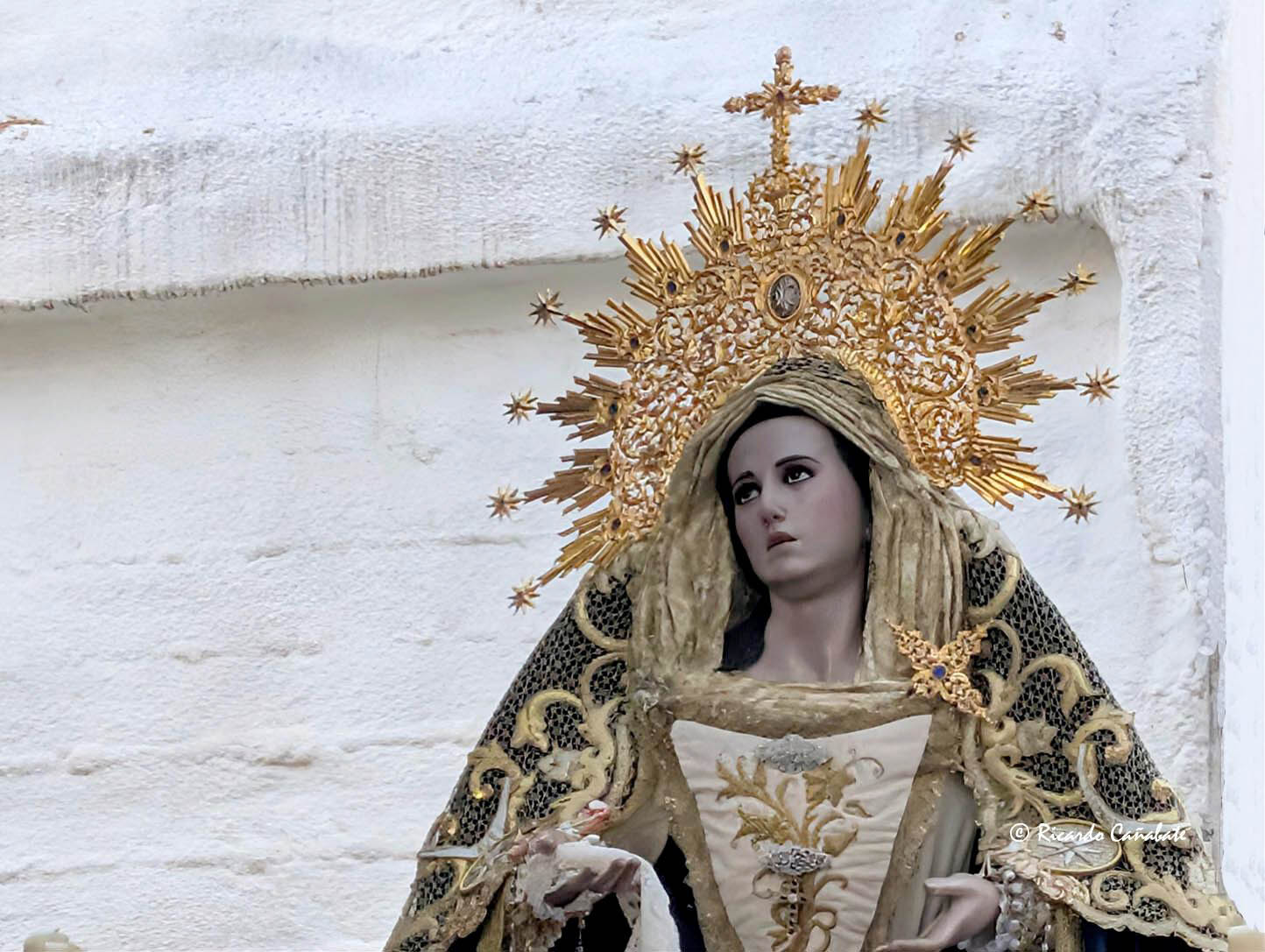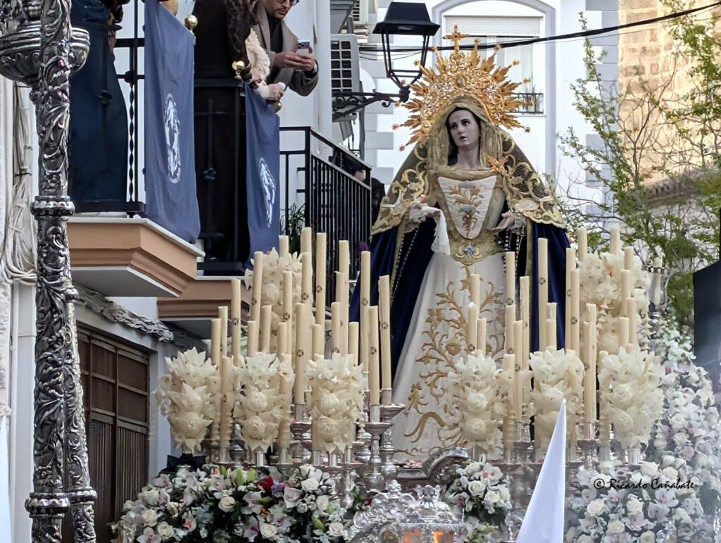 Tras él, hacía su salida la Virgen de la Soledad, acompañada por penitentes y mantillas. Su paso, portado por costaleras, ofrecía una estampa de gran elegancia, cuidadosamente adornado para una noche en la que la meteorología fue mejorando conforme avanzaban las horas. El cortejo se dirigió hacia el cruce del Carril, donde tuvo lugar uno de los momentos más esperados, con el giro para aguardar su encuentro con la Virgen, andes de volverse a girar para retomar el itinerario de la procesión.