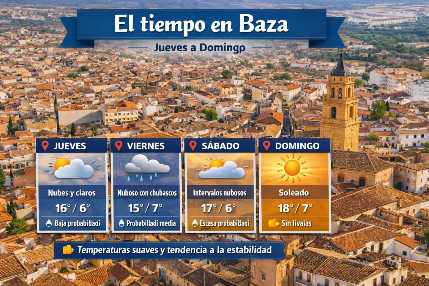 Previsión meteorológica para el tramo final de la Semana Santa en Baza y su zona de influencia. La llegada del primer fin de semana de abril estará marcada por un tiempo variable pero en general estable, con temperaturas suaves y una evolución hacia cielos más despejados conforme avance el fin de semana en Baza. Según las previsiones meteorológicas, se espera una situación típica de primavera, con alternancia de nubes y claros y posibilidad de lluvias débiles en algunos momentos puntuales.