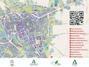 El plano recoge la ubicación de distintos espacios públicos que disponen de estos equipos, entre ellos la Casa Consistorial, la Biblioteca Municipal, instalaciones deportivas como el polideportivo y el pabellón, así como dependencias de seguridad y emergencias, como la Policía Local y el Parque de Bomberos. También aparecen centros educativos —como los institutos José de Mora, Pedro Jiménez Montoya y Alcrebite— y recursos sanitarios como el Centro de Salud y el Hospital Comarcal. Además, el mapa incluye un código QR que facilita el acceso a información adicional, lo que permite ampliar detalles sobre estos puntos o su disponibilidad.