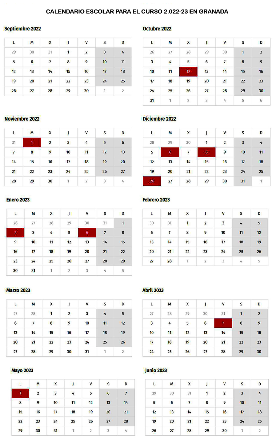 Aprobado el calendario escolar 2022-23 en Granada, con inicio de clases el 12 de septiembre y dos puentes para el día de Todos los Santos y el Día de Andalucía. La Delegación Provincial de la Consejería de Educación y Deporte de la Junta de Andalucía en Granada hacía pública la resolución que diseña el calendario escolar para el curso 2022-23, el cual dará inicio el día 12 de septiembre para el alumnado de Primaria , mientras que en la Secundaria dará comienzo el curso el jueves 15 de septiembre y el 20 lo hará en las escuelas de idiomas y enseñanzas artísticas superiores. Antes, estarán funcionando las clases del primer ciclo de Infantil, que se abrirán el primer día de ese mismo mes.