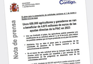 Unos 650.000 agricultores y ganaderos se van a beneficiar de 4.875 millones de euros de las ayudas directas de la PAC en 2023 que se pueden solicitar hasta el 31 de mayo. Alrededor de 650.000 agricultores pueden presentar, desde ayer, la solicitud única de las ayudas directas de la Política Agraria Común (PAC) para 2023, que cuentan con importe total de 4.875 millones de euros. Estas ayudas, que corresponden a la primera campaña en la que se aplica el Plan estratégico nacional de la PAC 2023-2027, se podrán abonar en forma de anticipos a partir del 16 de octubre y completar el saldo a partir del 1 de diciembre de 2023.