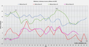 17 días de enero y 10 de febrero y el único día de marzo finalizado han registrado temperaturas bajo cero, es decir, de los 60 primeros días del año transcurridos, 28 han permitido ver que los termómetros descendían por debajo de los cero grados y, si nada cambia en exceso, tendremos que añadirlos días 2 y 3 de marzo, por lo menos, al coincidir con sendas alertas de nivel amarillo decretadas por AEMET a causa del riesgo provocado por las bajas temperaturas que se han pronosticado en nuestra zona y que, seguramente, no serán las últimas.