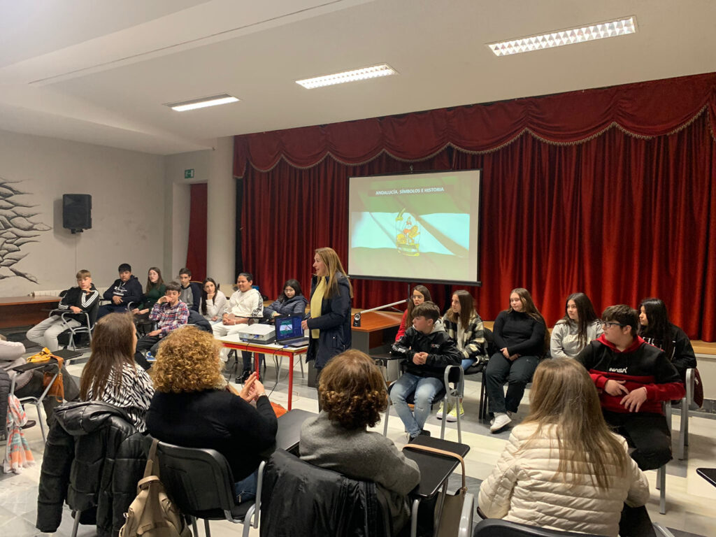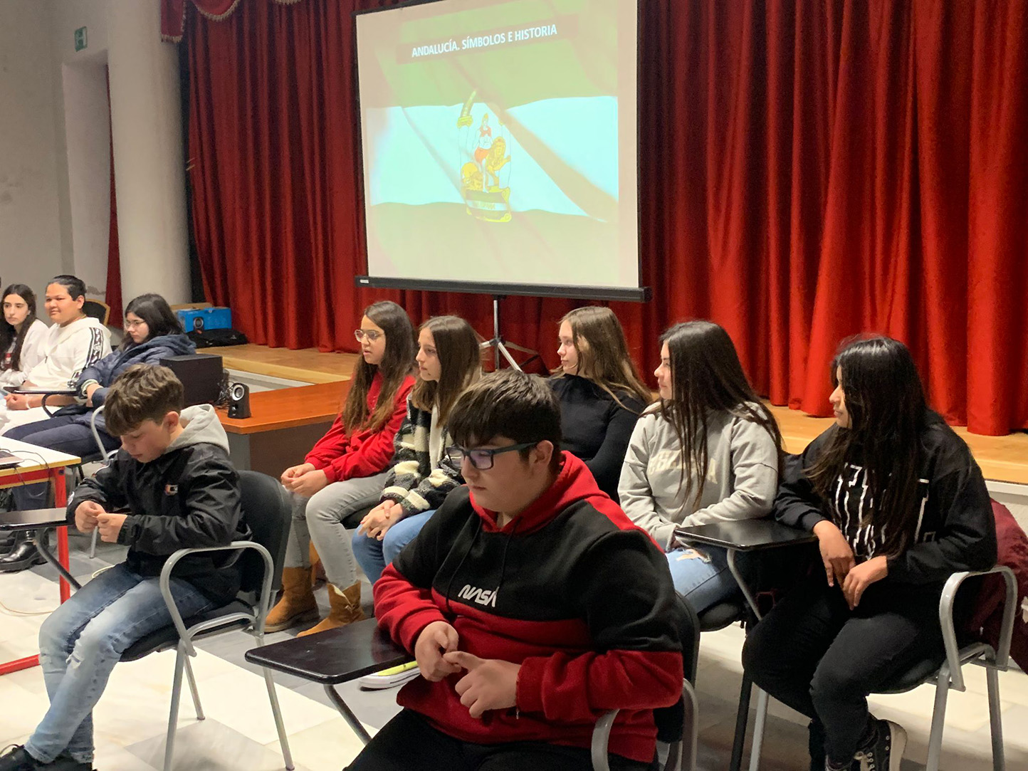 También en el marco de esta asignatura se coordinó la semana pasada la presencia en el Aula de alumnado de primer ciclo de Educación Secundaria Obligatoria del CEIP Santos Médicos de Cortes de Baza, dentro del Programa de Innovación Educativa “Vivir y Sentir el Patrimonio”. Se generó de esta forma un marco interdisciplinar de intercambio intergeneracional entre alumnado de secundaria y del Aula Permanente en el que los jóvenes estudiantes hicieron una exposición sobre “Andalucismo. Historia y símbolos”.