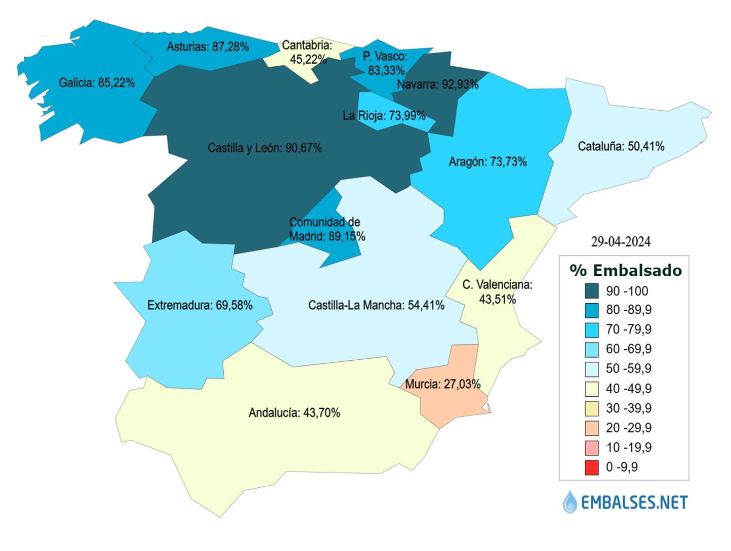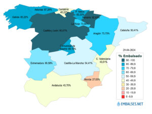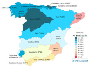 Las cuencas que se encuentran con un almacenamiento superior al 60% son: la del Duero al 91%, Cuencas internas del País Vasco al 90,5%, Miño-Sil al 86,9%, Cantábrico Occidental al 86,5%, Cantábrico Oriental se encuentra al 86,3%, Tinto, Odiel y Piedras al 84,7%, Galicia Costa al 80,6%, Tajo al 80% y Ebro al 73,3%.