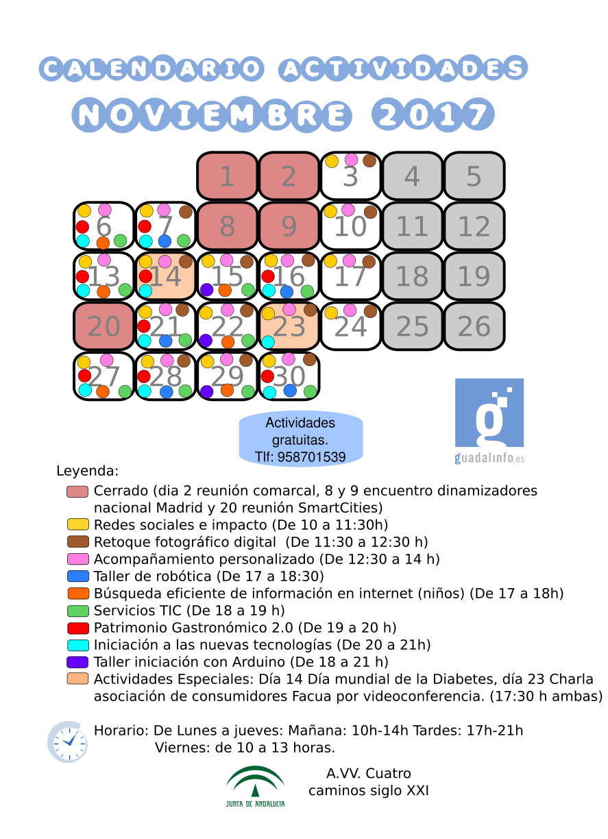 Calendario de actividades del centro CAPI Las Cuevas para el mes de noviembre. El centro CAPI oferta, para este mes de noviembre más activo que nunca, una serie de actividades que son totalmente gratuitas y que facilitan la adquisición de competencias digitales, para todo tipo de personas: