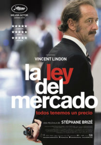 La asociación “Cine y Chocolate” proyecta el domingo 5 de noviembre, a las 10h30 h., en el Salón Ideal la película “La ley del mercado” (2015) de Stéphane Brizé. Según la crítica internacional el Festival de Cannes del año 2015, presidido por los directores estadounidenses Joel y Ethan Coen, fue de claro contenido social. Películas como “Dheepan” del cineasta francés Jacques Audiard, ganadora de la Palma de Oro, o “Son of Saul” del húngaro László Nemes, Premio del Jurado, lo demuestran claramente. Sin embargo, quizás “La ley del mercado”, también presentada a concurso, y ganadora finalmente del premio de interpretación masculina, sea la que mejor se ajuste a esa intencionalidad.