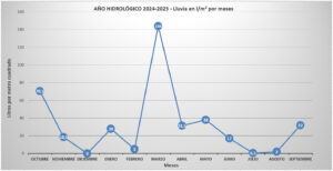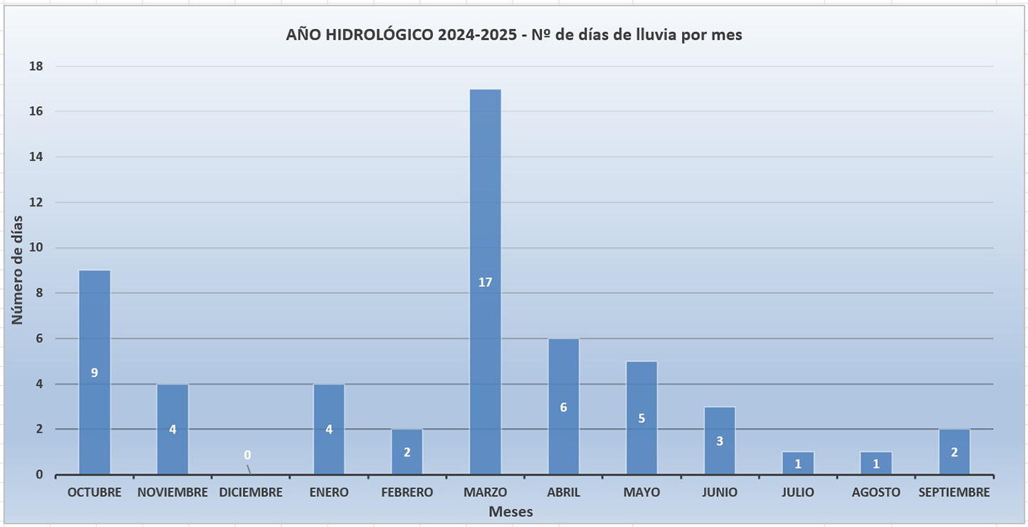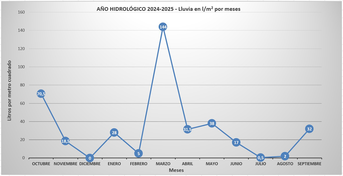 El mes más lluvioso fue marzo, que aportó por sí solo 144 l/m² en 17 jornadas, lo que equivale a más de un tercio de toda la lluvia caída en el año. Octubre también destacó con 70,5 l/m² en 9 días, iniciando el año hidrológico con un arranque esperanzador. Abril y mayo, con 31,5 y 38 l/m² respectivamente, contribuyeron también de manera notable, aunque ya en pleno final de la primavera.