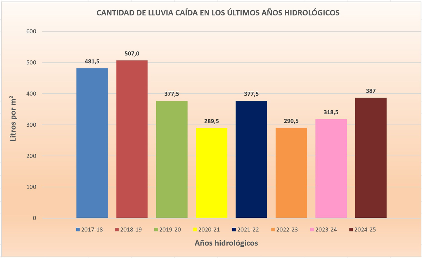 El análisis de los últimos años muestra la posición intermedia de este ejercicio. Desde 2017-2018, cuando se registraron 481,5 l/m², se han alternado años húmedos y secos, destacando 2018-2019 como el más lluvioso de la serie reciente con 507 l/m², y 2020-2021 como el más seco con apenas 289,5 l/m².