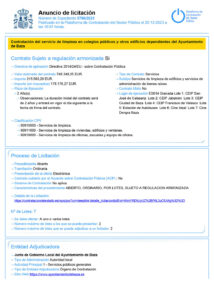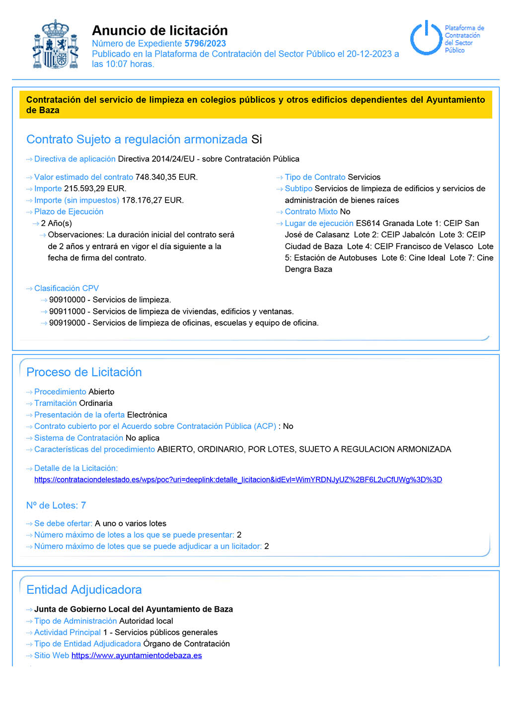 Sale a licitación la contratación del servicio de limpieza de colegios y edificios municipales como la Estación de Autobuses, el cine Ideal o el teatro Dengra. Ya está publicado y a disposición de los interesados, en la plataforma de contratación del sector público, el anuncio de licitación que va a regir la contratación del servicio de limpieza en colegios públicos dependientes del Ayuntamiento de Baza, así como en otros edificios de titularidad municipal como la estación de autobuses, el salón Ideal y el teatro Dengra. El procedimiento que se empleará será abierto, sujeto a regulación armonizada. El contrato se divide en siete lotes y cada uno tiene su presupuesto respectivo: