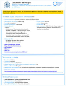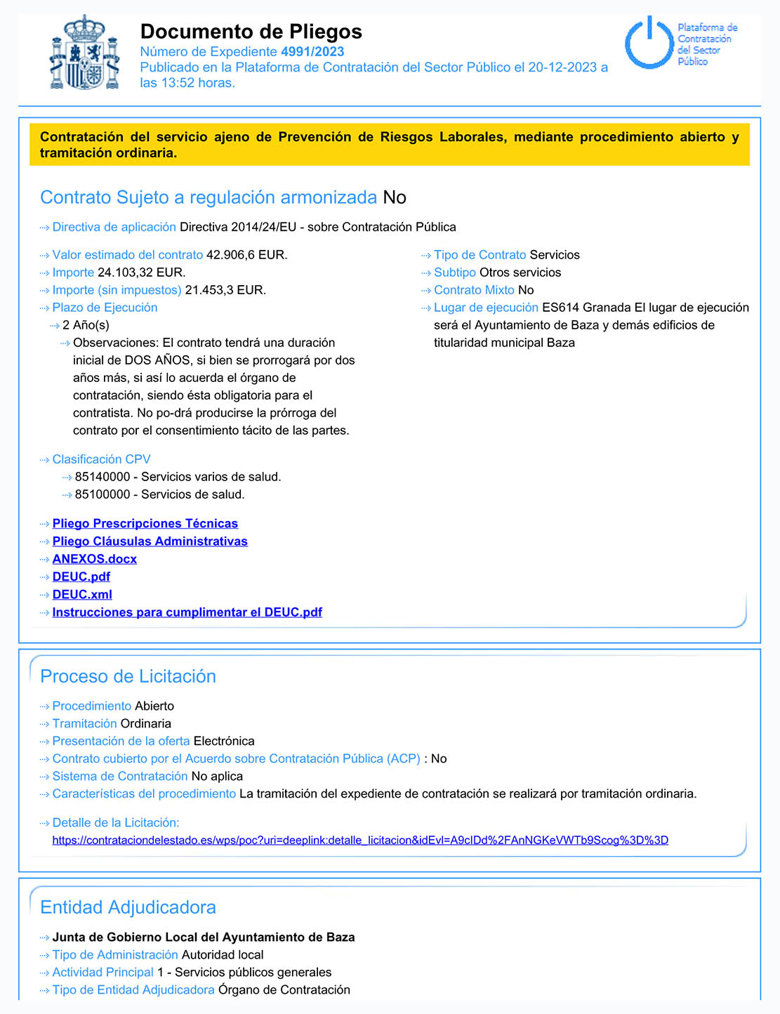 Publicado el anuncio de licitación para la contratación del servicio ajeno de Prevención de Riesgos laborales del Ayuntamiento de Baza. Una licitación para la que se podrán presentar las ofertas hasta el 4 de enero de 2024 y que ya se encuentra publicada en la plataforma de contratación del sector público el anuncio y los documentos correspondientes que van a regir la contratación del servicio ajeno de Prevención de Riesgos Laborales del Ayuntamiento de Baza mediante procedimiento abierto y tramitación ordinaria. El presupuesto base de licitación es de 24.103,32 euros, IVA incluido, para los dos años de duración del contrato. Las ofertas podrán presentarse hasta el día 4 de enero de 2024.