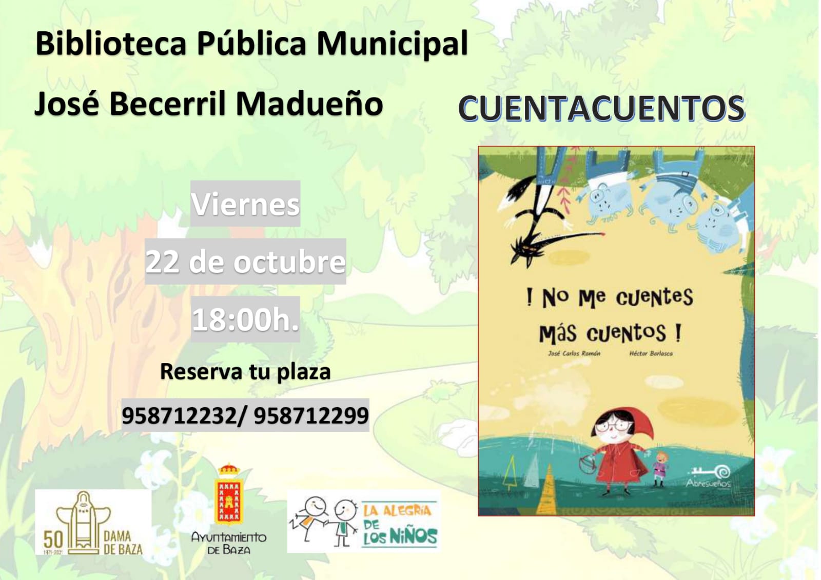 Por otro lado, se recupera también la actividad de Cuentacuentos este viernes 22 de octubre a las 18h con “No me cuentes más cuentos”. Para participar se puede reservar plaza en los teléfonos 958 71 22 32 y 958 71 22 99.