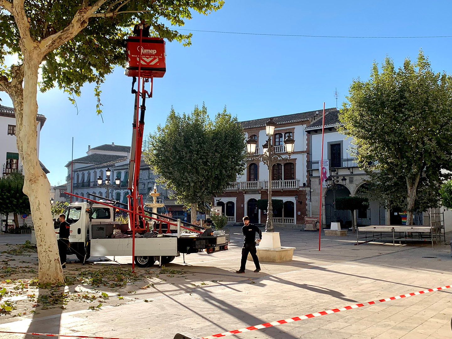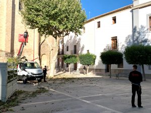 En el caso de Baza, los trabajos los estaba realizando la empresa Instalaciones Ilumep, que tiene su sede en la localidad granadina de Pinos Puente, cuyos operarios estaban colocando los soportes en los que colgarán los elementos que conformarán la iluminación artística navideña en nuestra ciudad, algo que realizaban en coordinación con operarios de jardinería del Ayuntamiento bastetano, quienes se encargaron de adecuar las circunstancias del arbolado, en evitación de situaciones que puedan influir en la posterior instalación de elementos eléctricos.