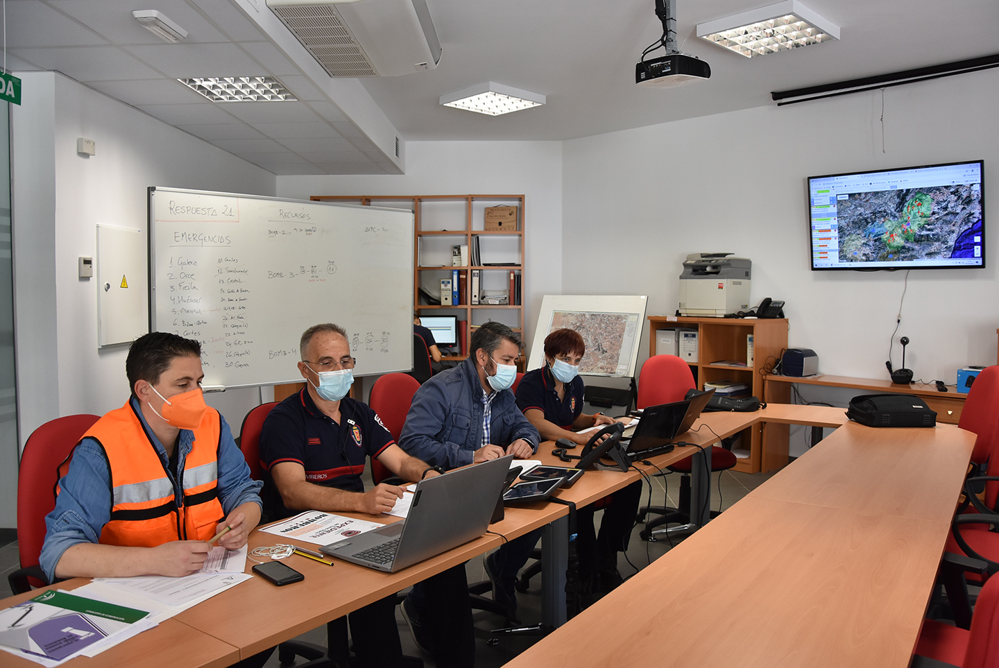 La simulación se desarrolló entre las 9,00 y las 14.30 h., sobre un guion base, a partir del cual se planteó cómo sería activar el Plan de Emergencias Municipal y la respuesta de los cuerpos de Policía Local, Bomberos y Protección Civil que, repartidos por el territorio, realizaron los distintos servicios simulados pertinentes, para evaluar la capacidad de respuesta ante una situación así.