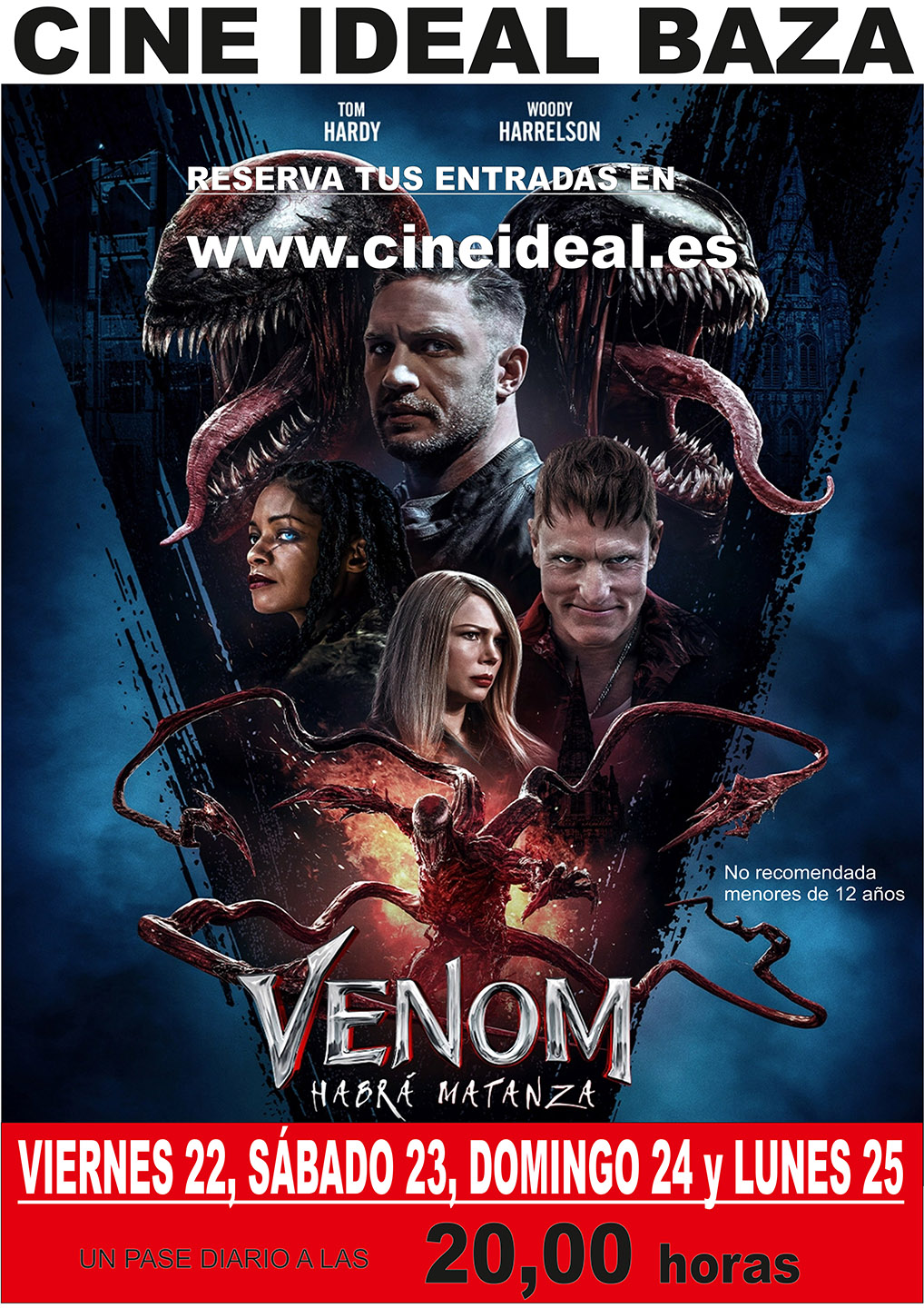 Nuevo estreno en Baza de una producción Marvel a partir del mañana viernes, en el Cine Ideal. Vuelve a las pantallas del Cine ideal, en la calle Alamillos, uno de los villanos más icónicos de Marvel… Venom. Una visita en la que está asegurado que habrá matanza, pues es una secuela de Venom de 2018 que lleva a la gran pantalla las aventuras de uno de los archienemigos más peligrosos del Spiderman de Marvel.