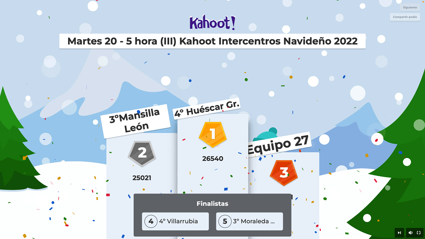 La próxima edición del Kahoot Intercentros Nacional será con motivo de la Cuaresma y las expectativas son muy altas, pues cerca de 100 profesores de toda España han manifestado su interés por unirse a esta iniciativa que año tras año va creciendo. Pero antes, y en mitad de Navidad, se va a organizar un Kahoot Familiar donde los alumnos, junto con sus padres, hermanos y abuelos podrán concursar a nivel nacional con preguntas relacionadas con la Navidad.