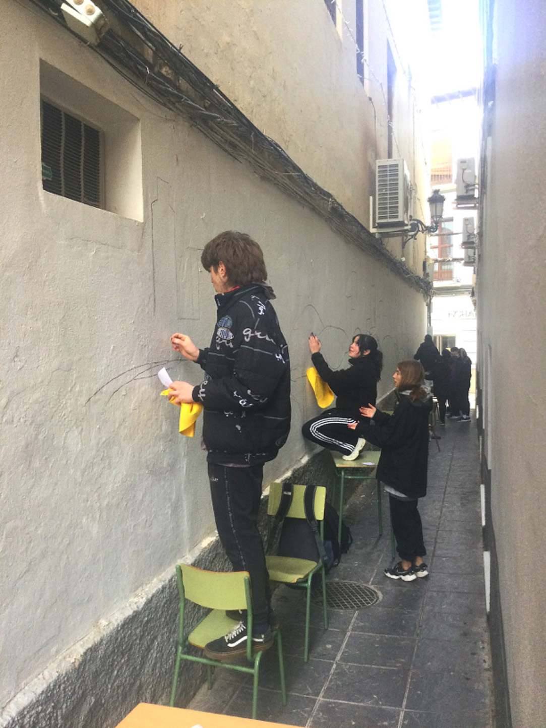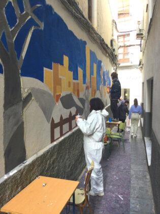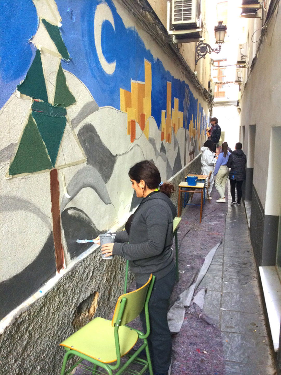 Alumnos del bachillerato de arte del IES José de Mora decoran el callejón del Yoyo con un mural navideño. Una de las vías más transitadas de nuestra ciudad, en la zona centro, es esta estrecha vía que comunica las plazas dela Encarnación y Serrano y que con su nombre recuerda el que fuera uno de los bares más míticos de la ciudad.