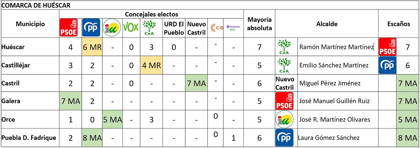 En los dos municipios restantes han sido necesarios los apoyos, destacando el caso de Huéscar, donde gobernaban PP junto a quienes se han integrado en la nueva lista de CxA, encabezada por el anterior alcalde que, recordemos, compartió mandato con el PP en la anterior legislatura, pero que ahora ha optado por apoyarse en el PSOE,  pesar de la mayoría relativa de los populares oscenses que, de esta forma, quedan fuera del Gobierno Municipal.
