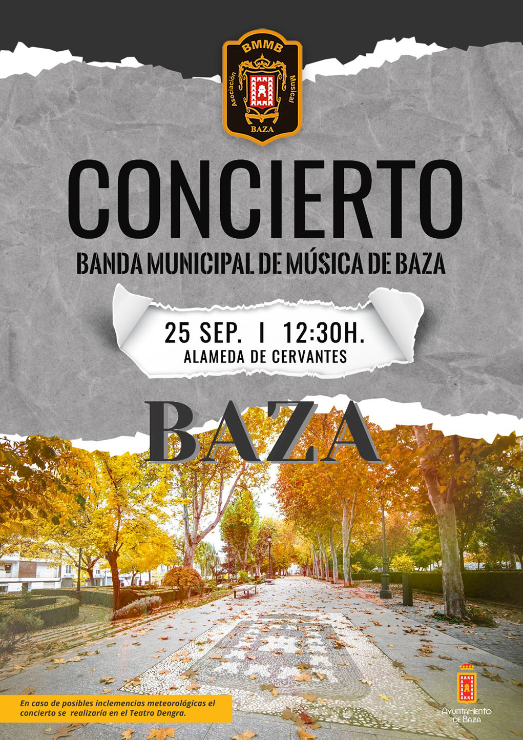 Damos la bienvenida, pues, al concierto de la ahora Asociación Municipal Banda Municipal de Música de Baza que tendrá lugar este domingo 25 de septiembre, a partir de las 12.30h., en el Parque Alameda, donde ofrecerán un bello repertorio de sus mejores composiciones.