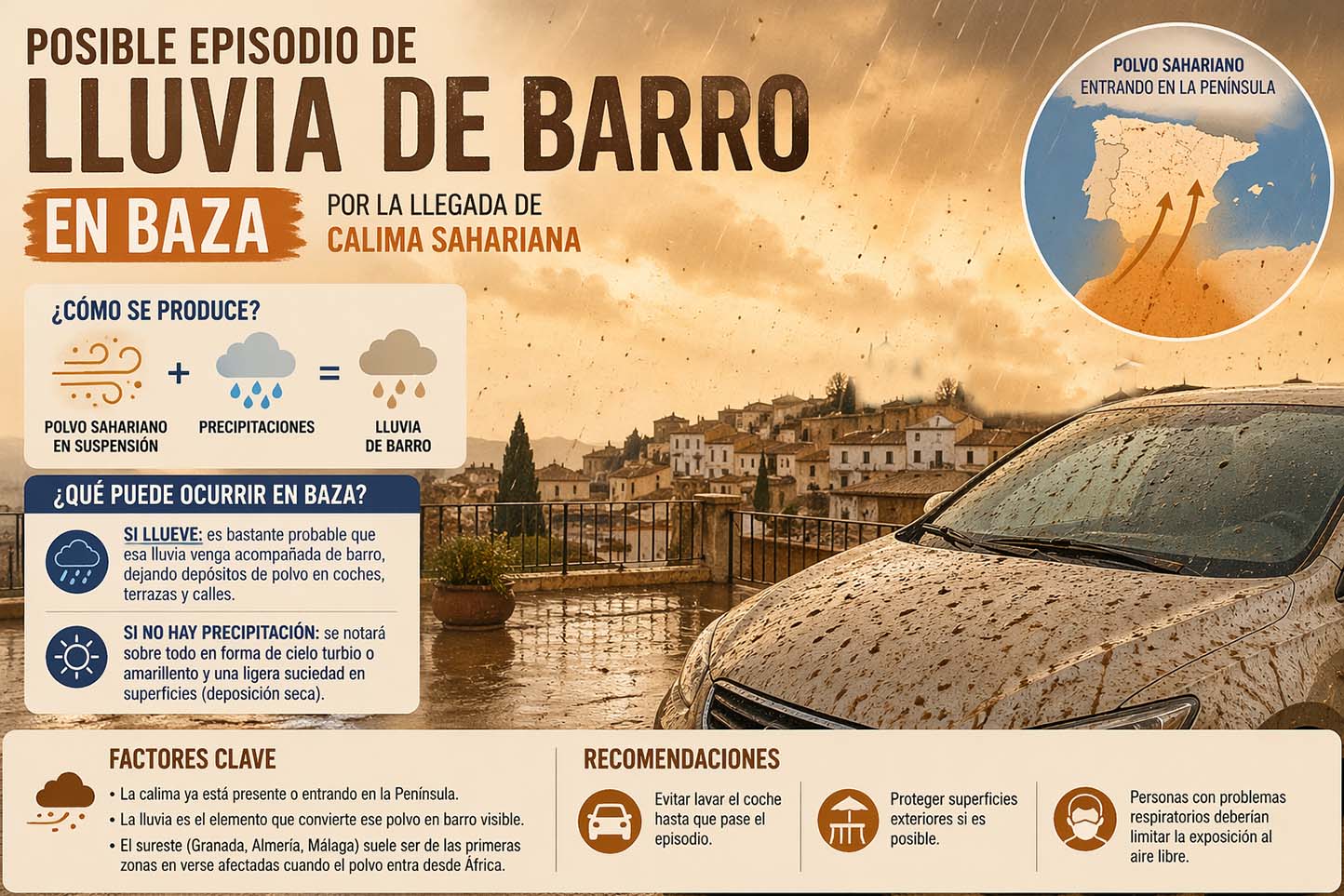 Posible episodio de lluvia de barro en Baza por la llegada de calima sahariana ante el nuevo riesgo de próximas precipitaciones. La localidad de Baza podría verse afectada, en las próximas horas y sobre todo mañana viernes, por un episodio de lluvia de barro, un fenómeno que depende de la coincidencia de dos factores atmosféricos: la presencia de polvo en suspensión procedente del Desierto del Sáhara y la aparición de precipitaciones.